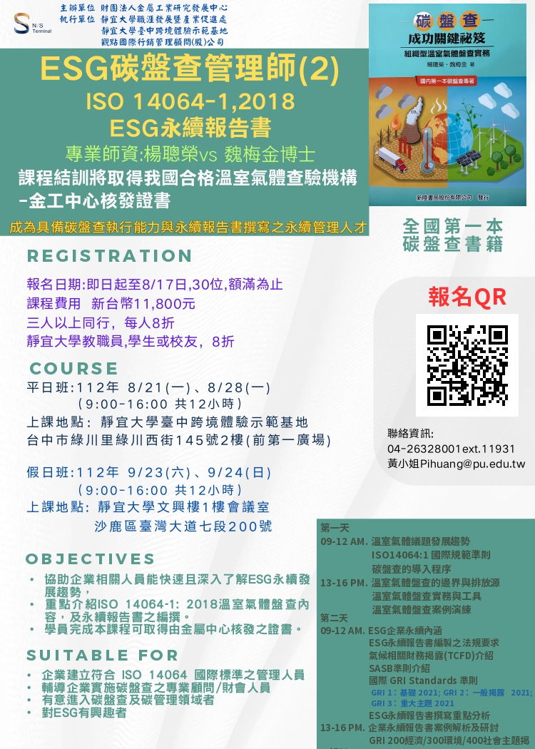 二、假日班:112年9月23日(六)【政府公告補班日】、9月24 日(日),9:00-16:00 共12小時。 三、上課地點:靜宜大學文 興樓一樓會議室(臺中市沙鹿區臺灣大道七段200號)。 四、 聯絡資訊: (一)聯絡人:職涯發展暨產業促進處黃珮珆小姐。 (二)聯絡電話:(04)2632-8001轉11931。 (三)E-mail:pihuang@pu.edu.tw 一、課程目標:協助相關人員能快速且深入了解ESG永續發展趨勢,重點介紹ISO14064-1: 2018溫室氣體盤查內容及永續報告書之編撰。 二、假日班:112年9月23日(六)【政府公告補班日】、9月24 日(日),9:00-16:00 共12小時。 三、上課地點:靜宜大學文 興樓一樓會議室(臺中市沙鹿區臺灣大道七段200號)。 四、 聯絡資訊: (一)聯絡人:職涯發展暨產業促進處黃珮珆小姐。 (二)聯絡電話:(04)2632-8001轉11931。 (三)E-mail:pihuang@pu.edu.tw