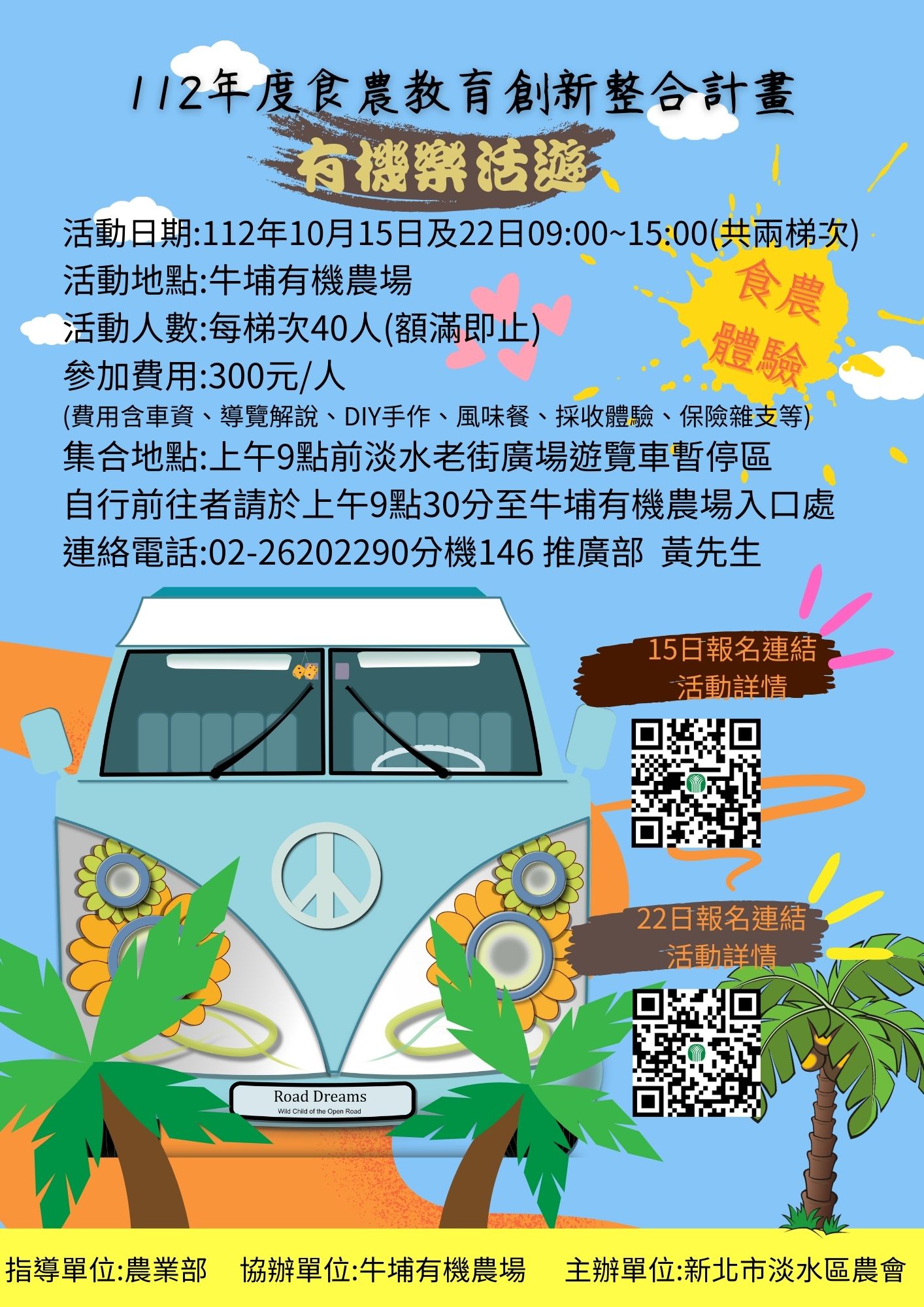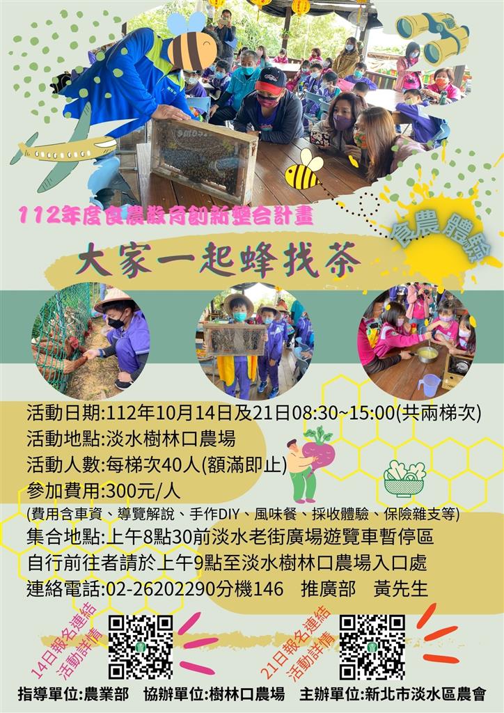 112年度食農教育創新整合計畫 農業體驗活動開跑囉 活動日期::10月14日及21日(六)/ 10月15日及22日(日) 活動內容:大家一起蜂找茶/有機樂活趣 活動地點:淡水樹林口農場/牛埔有機農場 聯絡專線:02-26202290分機146 推廣部黃先生 指導單位:農業部 主辦單位:新北市淡水區農會 協辦單位:樹林口農場、牛埔有機農場 附件下載: