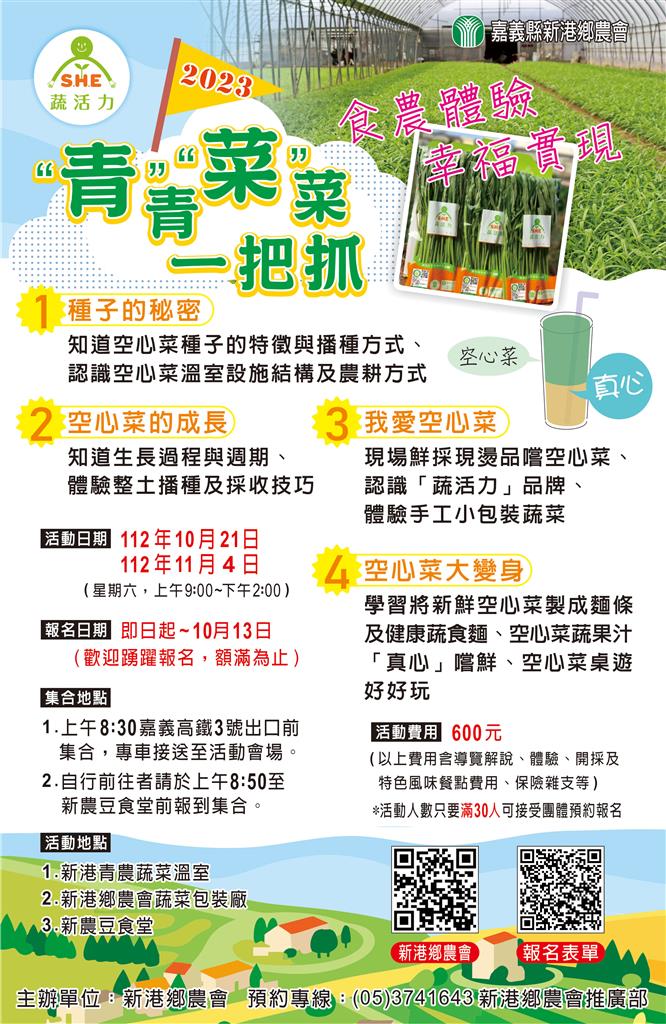 112年度食農教育創新整合計畫 青青菜菜一把抓 食農體驗幸福實現活動開跑囉 活動日期:10月21日(六)、11月4日(六) 活動時間:上午09:00~下午2:00 活動內容:種子的秘密/空心菜的成長/我愛空心菜/空心菜大變身 集合地點: 專車接送:上午8:30至嘉義高鐵3號出口集合。 自行前往:上午8:50至新農豆食堂前報到集合。 報名日期:即日起至10月13日(歡迎踴躍報名,額滿為止)。 聯絡專線:05-3741643 新港鄉農會推廣部 主辦單位:新港鄉農會