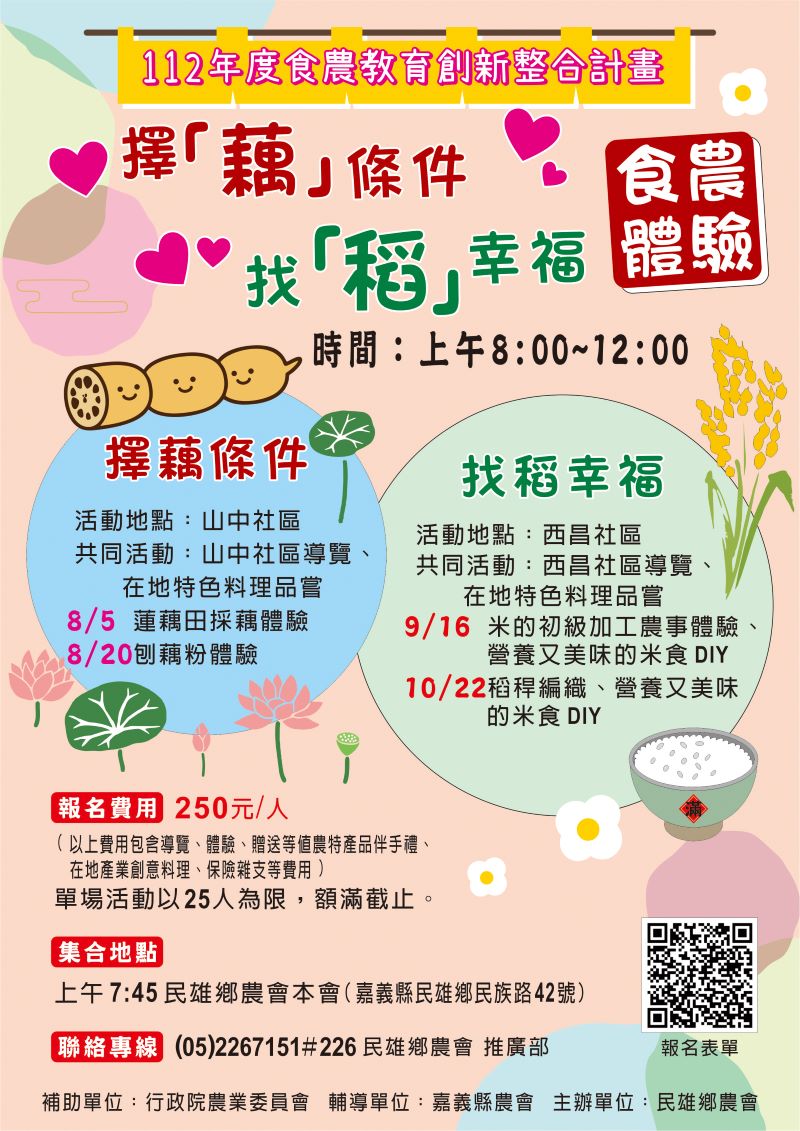 112年度食農教育創新整合計畫 擇「藕」條件 找「稻」幸福食農體驗活動 開跑囉!! 日期:8/5、8/20 擇「藕」條件;9/16、10/22 找「稻」幸福 時間:上午8:00~12:00 報名費用:250元/人(名額有限,額滿截止) 集合地點:上午7:45 民雄鄉農會本會 聯絡專線:(05)2267151#226 民雄鄉農會 推廣部 補助單位:行政院農業委員會 輔導單位:嘉義縣農會 主辦單位::民雄鄉農會 附件下載: 無