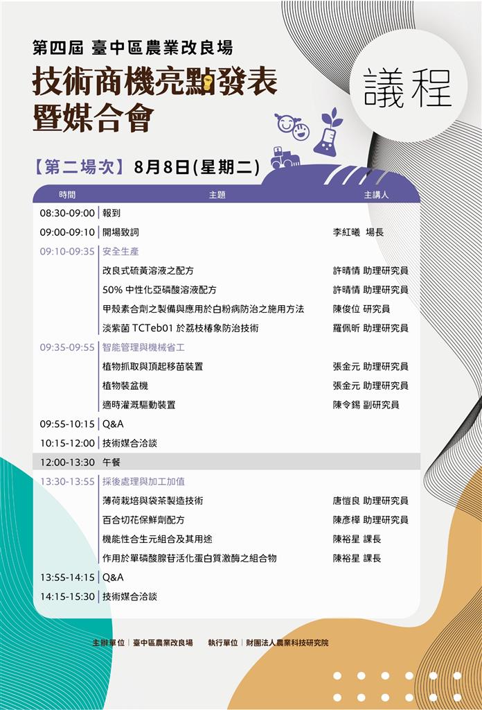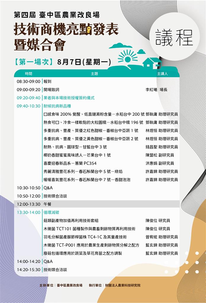 一、辦理日期:112年8月7、8日(星期一、二)。 二、報名網址:https://forms.gle/Bqu2nY76cmYZ18J89 三、活動窗口:財團法人農業科技研究院 曹雅芳 專案經理 電 話:03-5185179 E-mail:1122049@mail.atri.org.tw。 四、活動地點:集思新烏日會議中心。