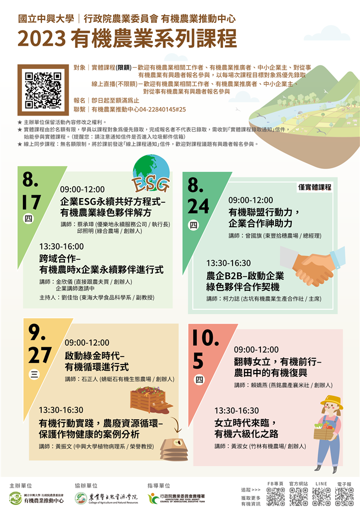 一、目的:為促進有機農業發展與有機理念建立,以及提升有機產業 與企業ESG實踐合作之交流,有機農業推動中心舉辦「2023有機農業系列課程」,敬邀有機農業相關工作者、 有機農業推廣者、中小企業主、對從事有機農業有興趣者一同參與。惠請公告課程相關訊息,並轉知相關人員報名參加。 二、課程對象:有機農業相關工作者、中小企業主、有機農業推廣者、對從事有機農業有興趣者。 三、報名方式:統一網路報名,實體課程名額有限,額滿為止;線上同步不限額(報名網址:https://www.oapc.org.tw/2023-0817_organic-knowledge/)。