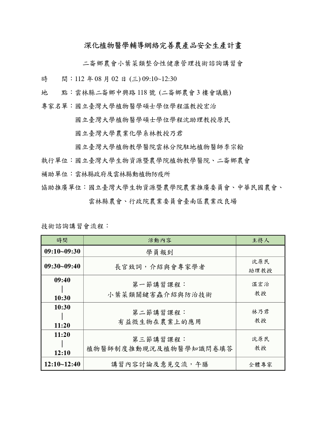 一、辦理日期:112年8月2日(星期三)。 二、執行單位:國立臺灣大學生物資源暨農學院植物教學醫院、二崙鄉農會。 三、補助單位:雲林縣政府及雲林縣動植物防疫所。