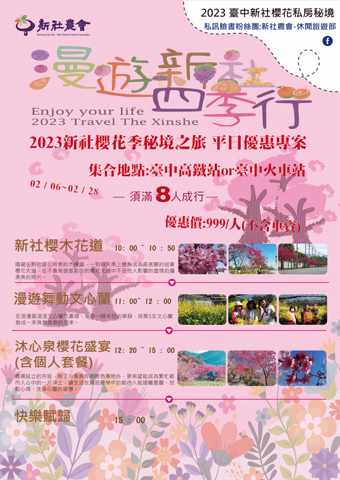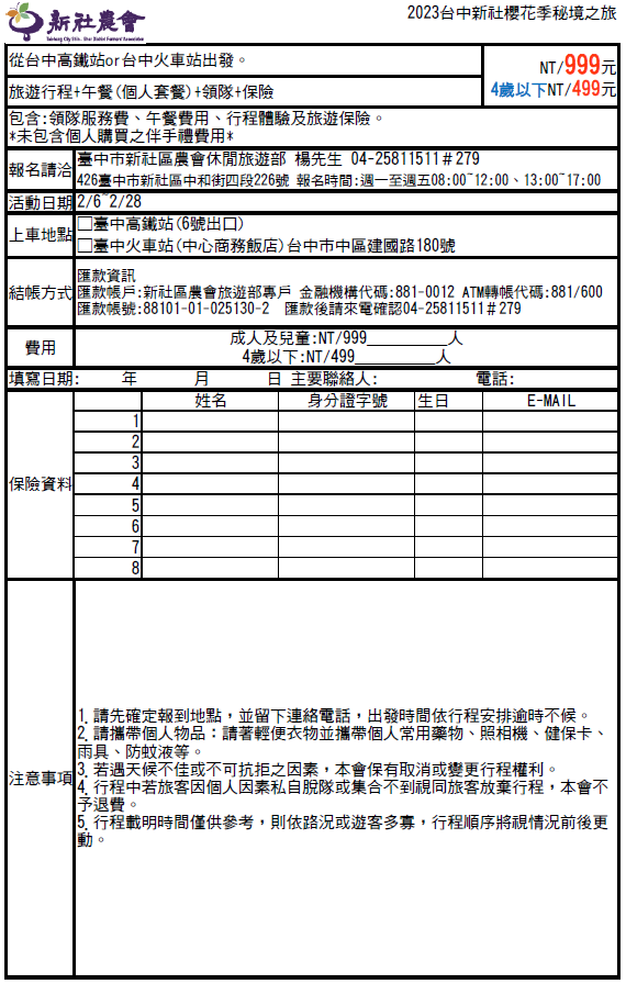 一、主辦單位:新社區農會。 二、聯絡資訊:新社區農會休閒旅遊部 楊先生,04-05811511 分機279 。