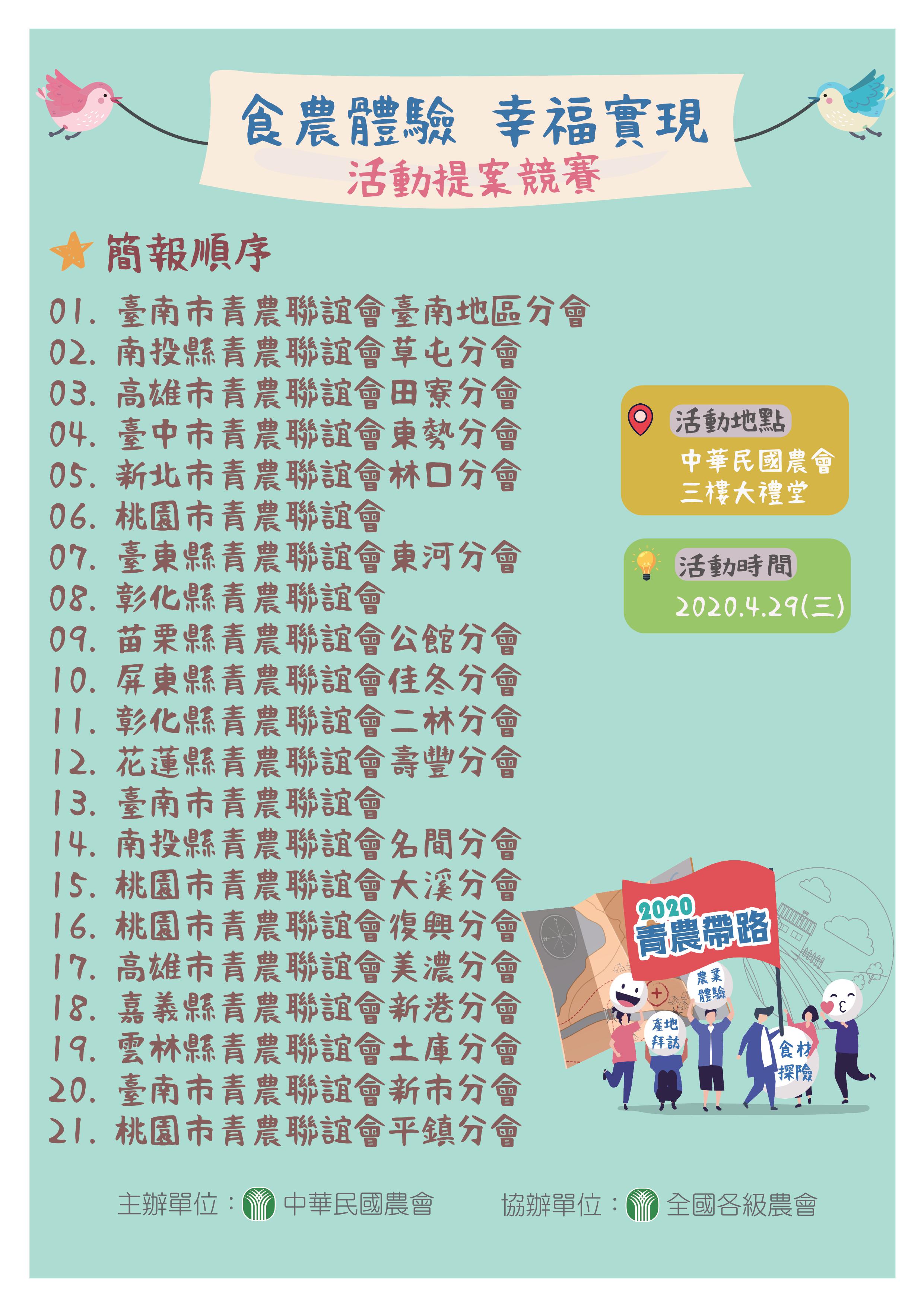 「2020青農帶路-食農體驗 幸福實現」活動提案競賽 簡報順序出爐囉~~ 期待各提案團隊精彩的簡報! 4/29咱們農會見囉! 抽籤影片實錄:https://youtu.be/UMkbINfnbuk