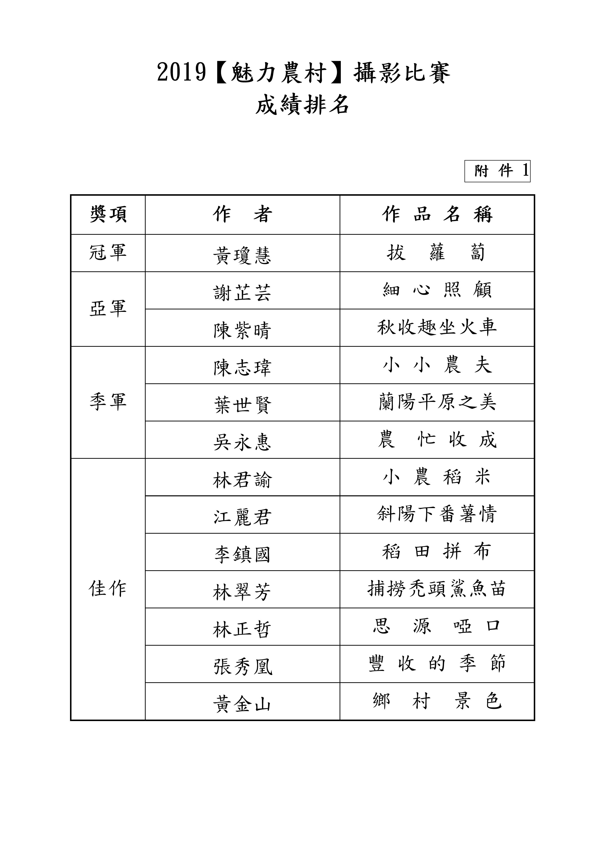 感謝大家熱烈參與本比賽,也恭喜各位得獎者在眾多競爭者中脫穎而出。 經評審結果,有3件作品分數相同並列第11名,經評審建議增額一名同列佳作。 最終結果計13件作品入選,冠軍1名、亞軍2名、季軍3名、佳作7名。