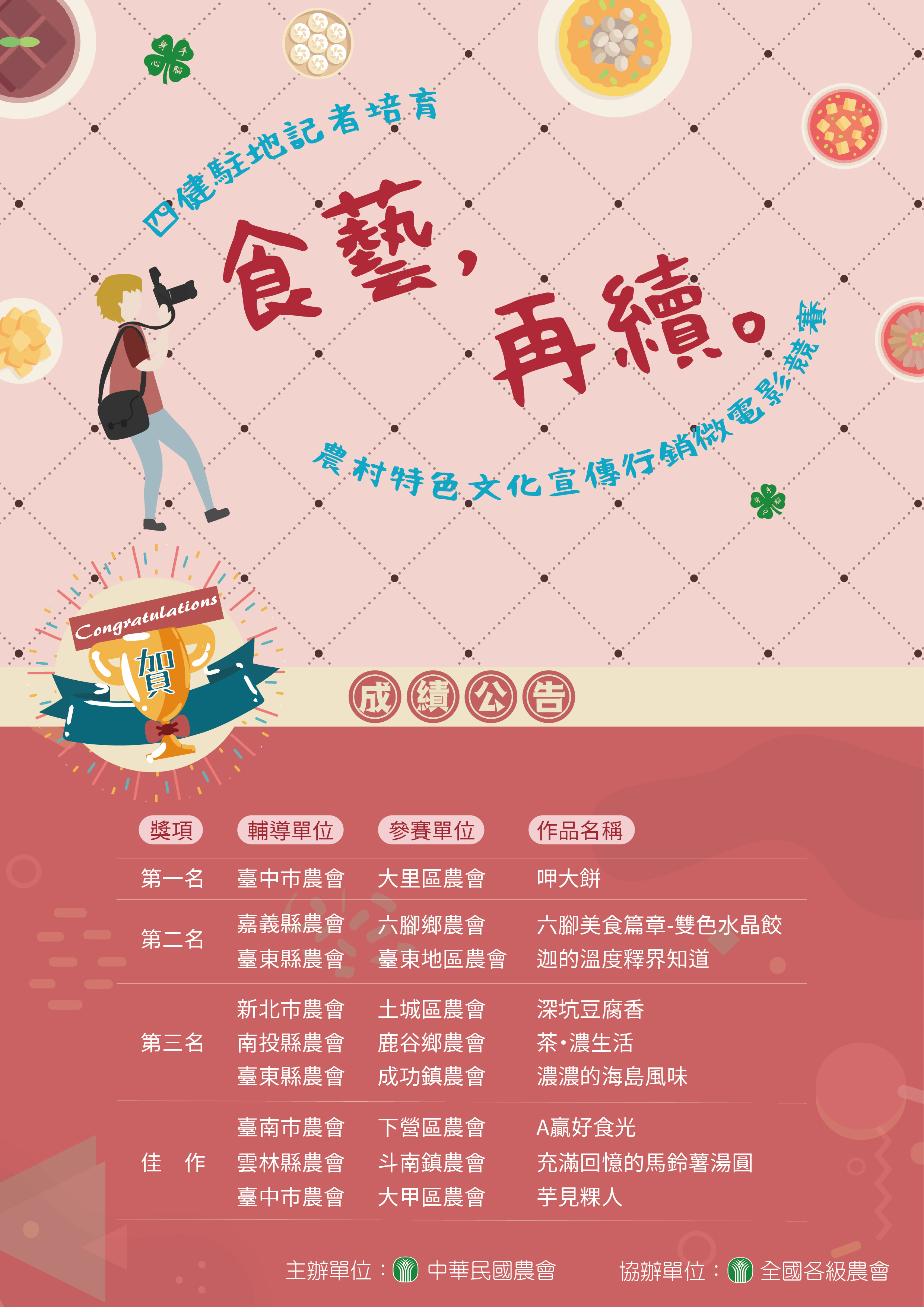 四健駐地記者培育-微電影競賽系列活動 今年以「農村特色小吃」為素材,透過鏡頭徵集農村巷弄的雋永美味,經評審絞盡腦汁,最後有9件作品脫穎而出,讓我們一起來看看今年的優勝作品吧! 優勝作品網址 https://ppt.cc/fPIiox 恭喜得獎的各位 四健駐地記者培育~我們明年見