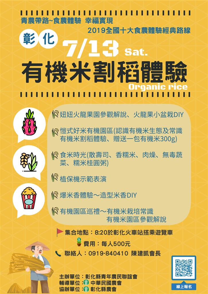 2019全國十大食農體驗經典路線~彰化站 彰化‧有機米割稻體驗#秒殺團即將額滿 活動時間:7月13日(週六) 8:20-16:00 集合地點:8:20彰化火車站前集合搭乘遊覽車 活動費用:每人500元 報名日期及截止日:108年7月3日止 活動內容 ??妞妞火龍果園 (果園參觀解說、火龍果小盆栽DIY) ??愷式好米有機園區(認識有機好米的生態及常識、有機米割稻體驗、贈送一包有機米300g) ??食米時光(散壽司、香糯米、肉燥、無毒蔬菜、糯米桂圓粥) ??植保機示範表演 ??爆米香體驗(造型米香DIY) ??有機園區巡禮(有機栽培常識介紹、有機園區參觀解說) 主辦單位保有調整行程之權利 活動連絡人:0919-840410 陳建凱會長 報名網址:https://www.beclass.com/rid=224158c5cf608bdcb896 臉書搜尋: 愷式好米 阿瑋米香 妞妞火龍果園 施偉皓 #青農帶路食農體驗幸福實現 #全國十大食農體驗經典路線彰化站