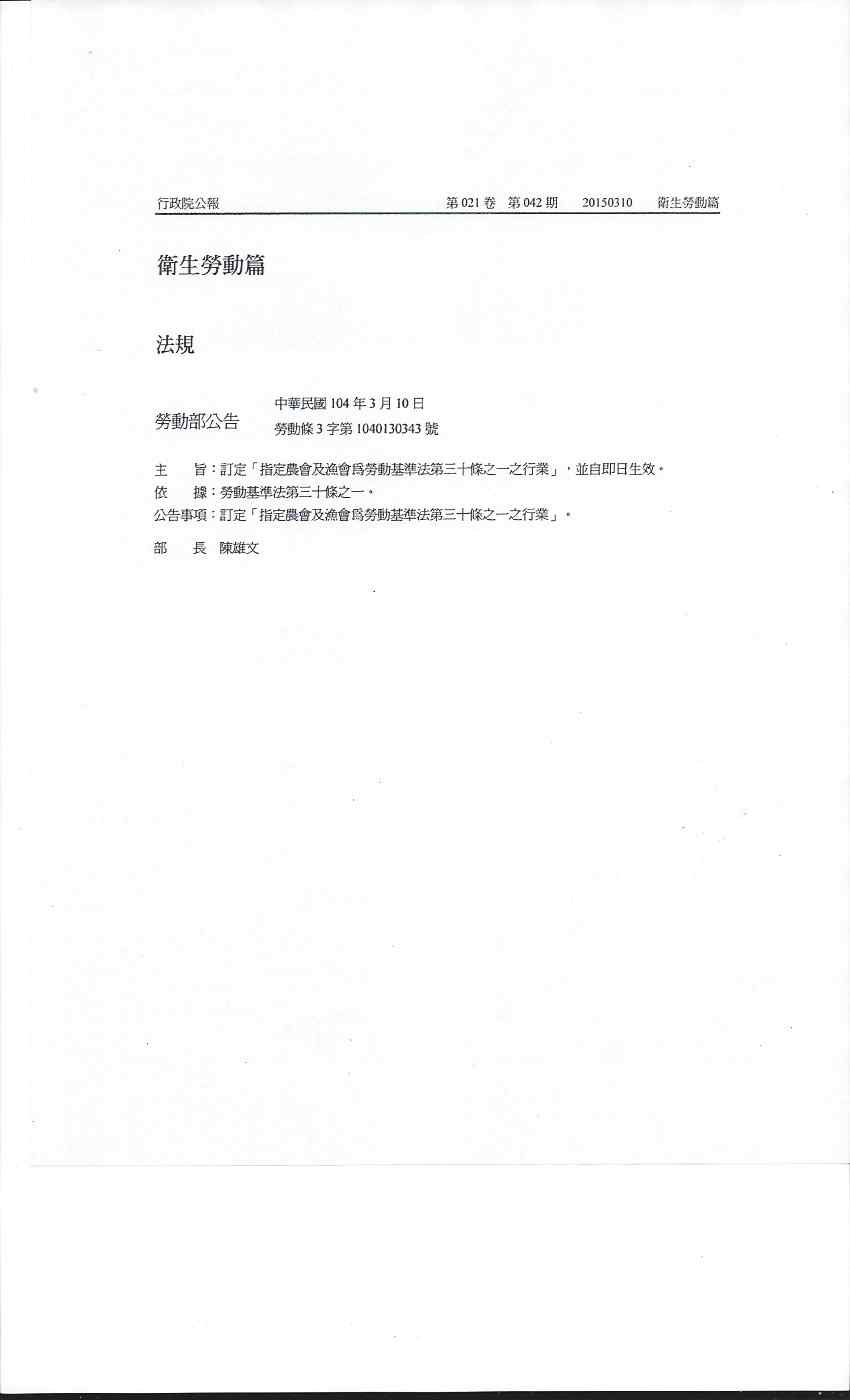勞動部公告農會即日起為勞動基準法第30-1之行業