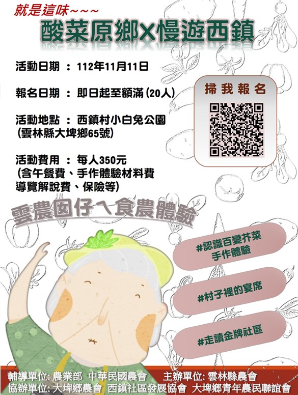 酸菜原鄉 × 慢遊西鎮 活動開跑囉!! 活動日期:11月11日(六) 活動內容:認識百變芥菜(手作體驗)、村子裡的宴席、走讀金牌社區(依實際內容為主) 活動地點:西鎮村小白兔公園 報名請洽:推廣部 黃小姐 (05)5974101分機229 報名連結:https://forms.gle/EUj77RfwfvJ1tTea8 輔導單位:農業部、中華民國農會 主辦單位:雲林縣農會 協辦單位:大埤鄉農會、西鎮社區發展協會、大埤鄉青年農民聯誼會