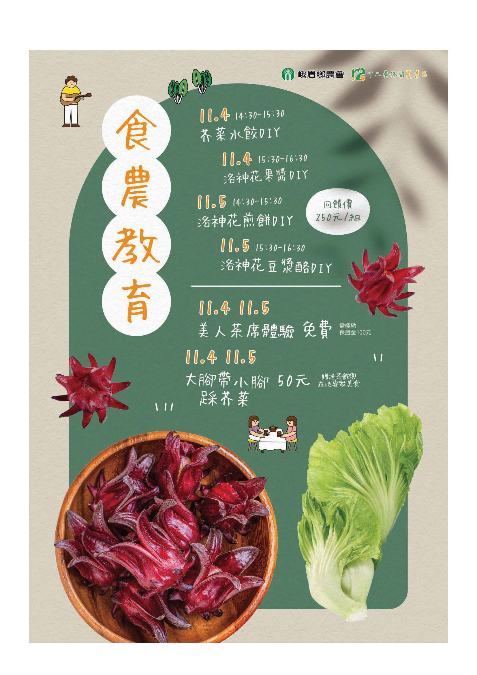 2023慢漫時光村濃農客家情 樂活秋季農遊 活動開跑!! 活動日期:11月4日(六)、5日(日) 活動內容:芥菜水餃DIY、洛神花果醬DIY、洛神花煎餅DIY、洛神花豆漿酪DIY、美人茶席體驗、大腳帶小腳採芥菜(依各場次內容為主) 活動地點:十二寮休閒農業區-阿財伯橘園 指導單位:農業部、新竹縣政府 主辦單位:峨眉鄉公所、峨眉鄉農會 協辦單位:十二寮休閒農業區管理委員會