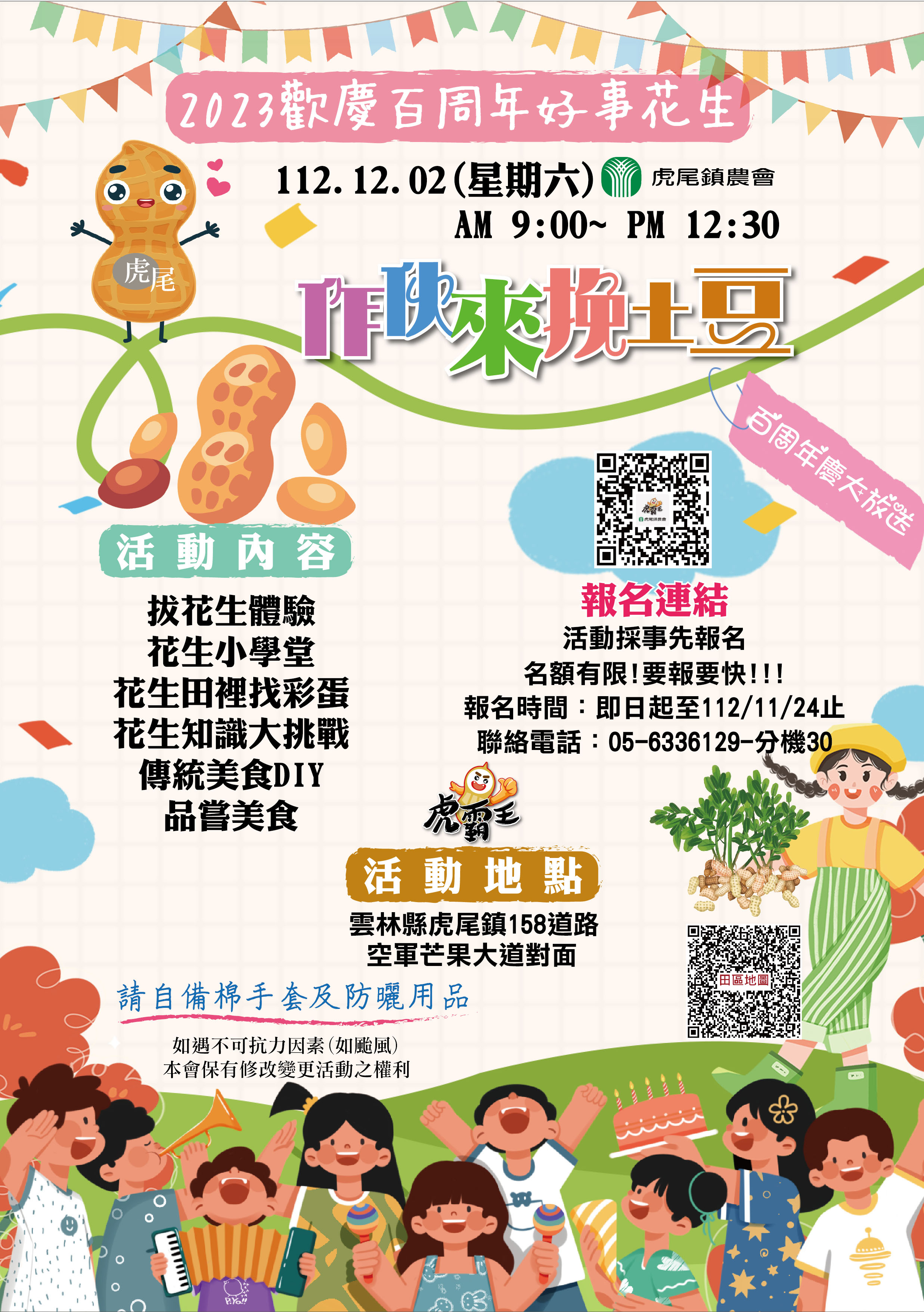 2023歡慶百周年好事花生 活動開跑囉!! 活動日期:12月2日(六) 上午9:00—12:30 活動內容:拔花生體驗、花生小學堂、花生田裡找彩蛋、花生知識大挑戰、傳統美食DIY、品嚐美食(依實際內容為主) 活動地點:雲林縣虎尾鎮158縣道 聯絡電話:05-6336129分機30 報名連結:https://forms.gle/BMsQjP7nbaSWJk7n8 報名時間:即日起至11月24日止 *活動採事先報名,名額有限!要報要快!! *請自備棉手套及防曬用品 主辦單位:虎尾鎮農會