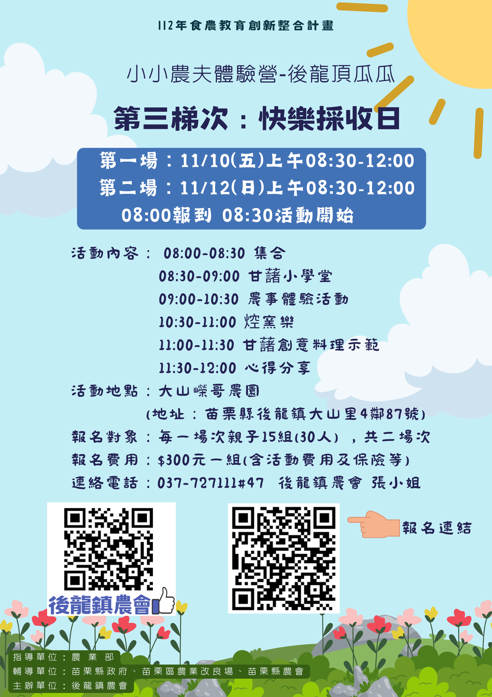 快樂採收日開跑囉!! 活動日期:11月10日(五)、11月12日(日) 活動內容:甘藷小學堂、農事體驗活動、焢窯樂、甘藷創意料理示範、心得分享(依實際內容為主) 活動地點:大山嶸哥農園 洽詢專線:037-727111分機47 推廣張小姐 指導單位:農業部 輔導單位:苗栗縣政府、苗栗區農業改良場、苗栗縣農會 主辦單位:後龍鎮農會