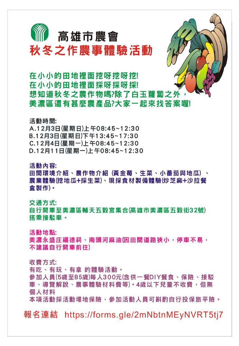 秋冬之作農事體驗活動開跑囉!! 活動日期:12月3日(日)、12月4日(一)、12月11日(一) 活動內容:田間環境介紹、農作物仲紹、現採食材製備體驗(依實際內容為主) 活動地點:美濃永盛庄福德祠、南頭河麻油 主辦單位:高雄市農會