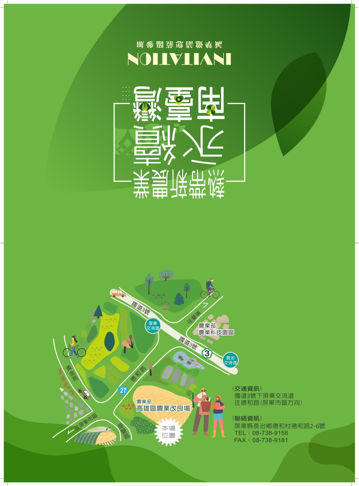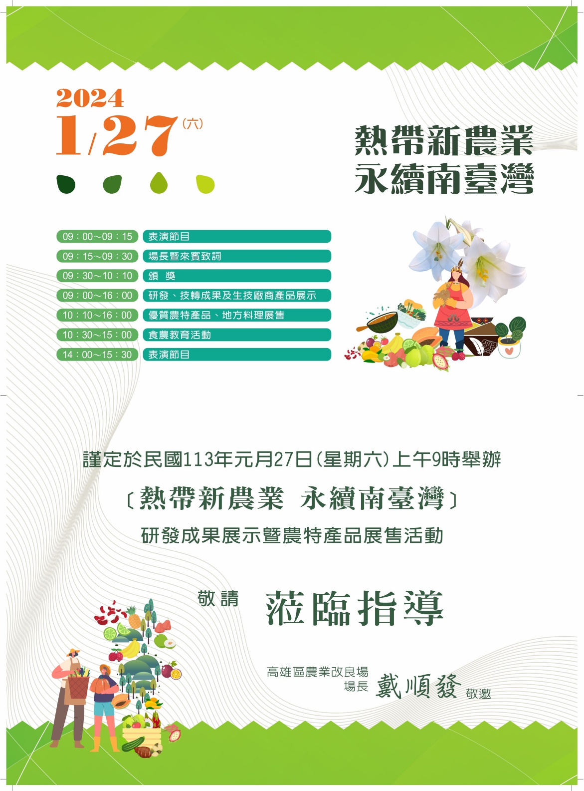 一、舉辦時間:113年1月27日(星期六)舉辦「熱帶新農業 永續南台灣」研發成果展示暨農特產品展售活動。 二、舉辦地點 : 農業部高雄區農業改良場(屏東縣長治鄉德和村德和路2-6號。 三、舉辦時間 : 上午9時至下午4時。 四、附件檢附「熱帶新農業 永續南台灣 」迎賓日活動節目表1份。
