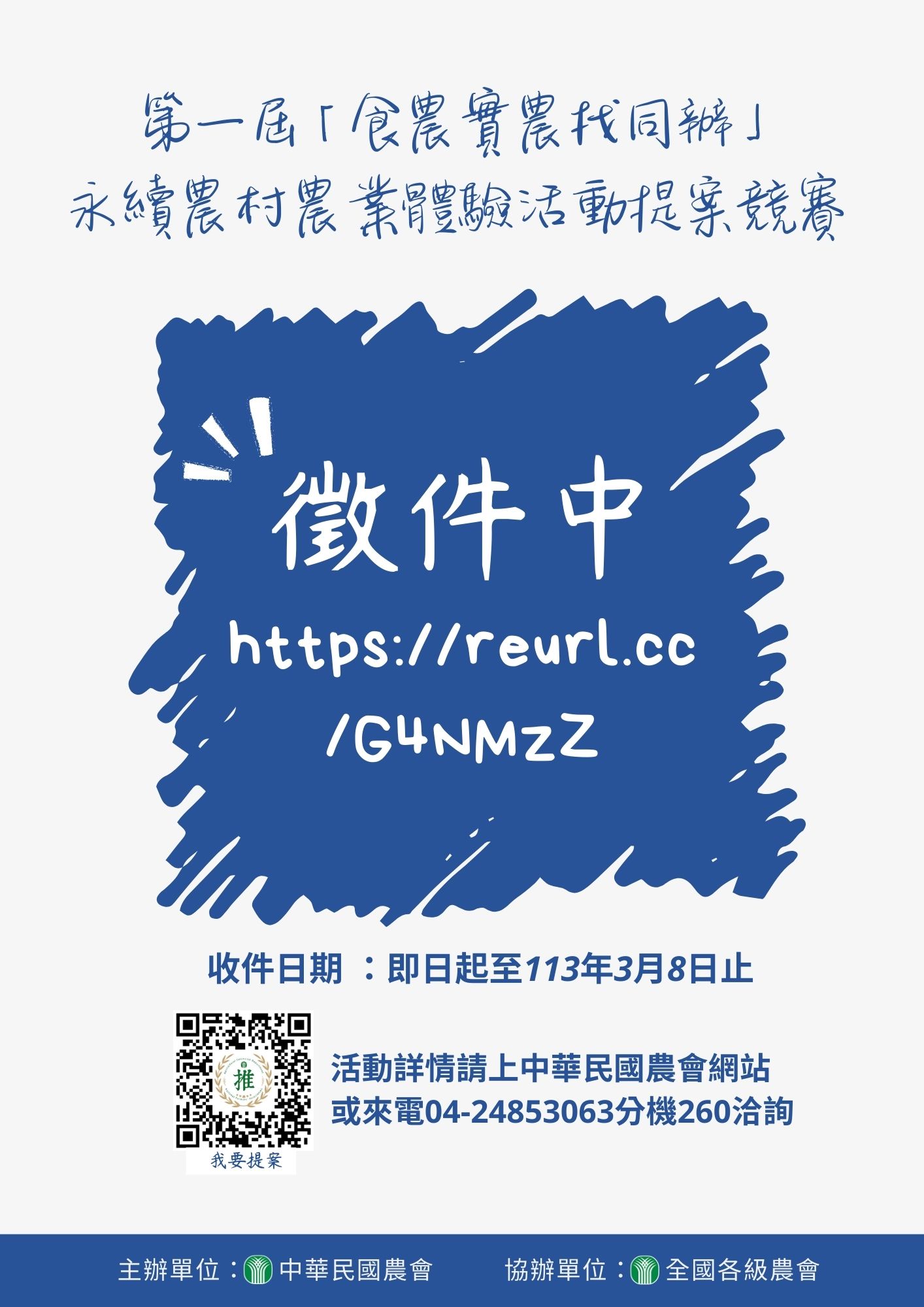 第一屆「食農實農找同辦」永續農村農業體驗活動提案競賽 一、競賽相關期程: (一)收件日期:即日起至113年3月8日止。 (二)評選日期:暫定113年3月15日。 (三)獲選公告:暫定113年3月22日。 二、提案主題內容:請就在地農業資源結合人、文、地、產、景及美食等自行設定主題,規劃1日(6小時)之體驗活動,內容概括導覽解說、產業踏查、文化洗禮、手作體驗及在地特色小吃等。 三、送件方式:請依提案辦法附件表格填寫並檢附相關參考資料,一式5份,於3月8日前寄送本會並來電04-24853063#260確認。 四、提案競賽辦法連結:https://reurl.cc/G4NMzZ 五、活動諮詢:04-24853063分機260。