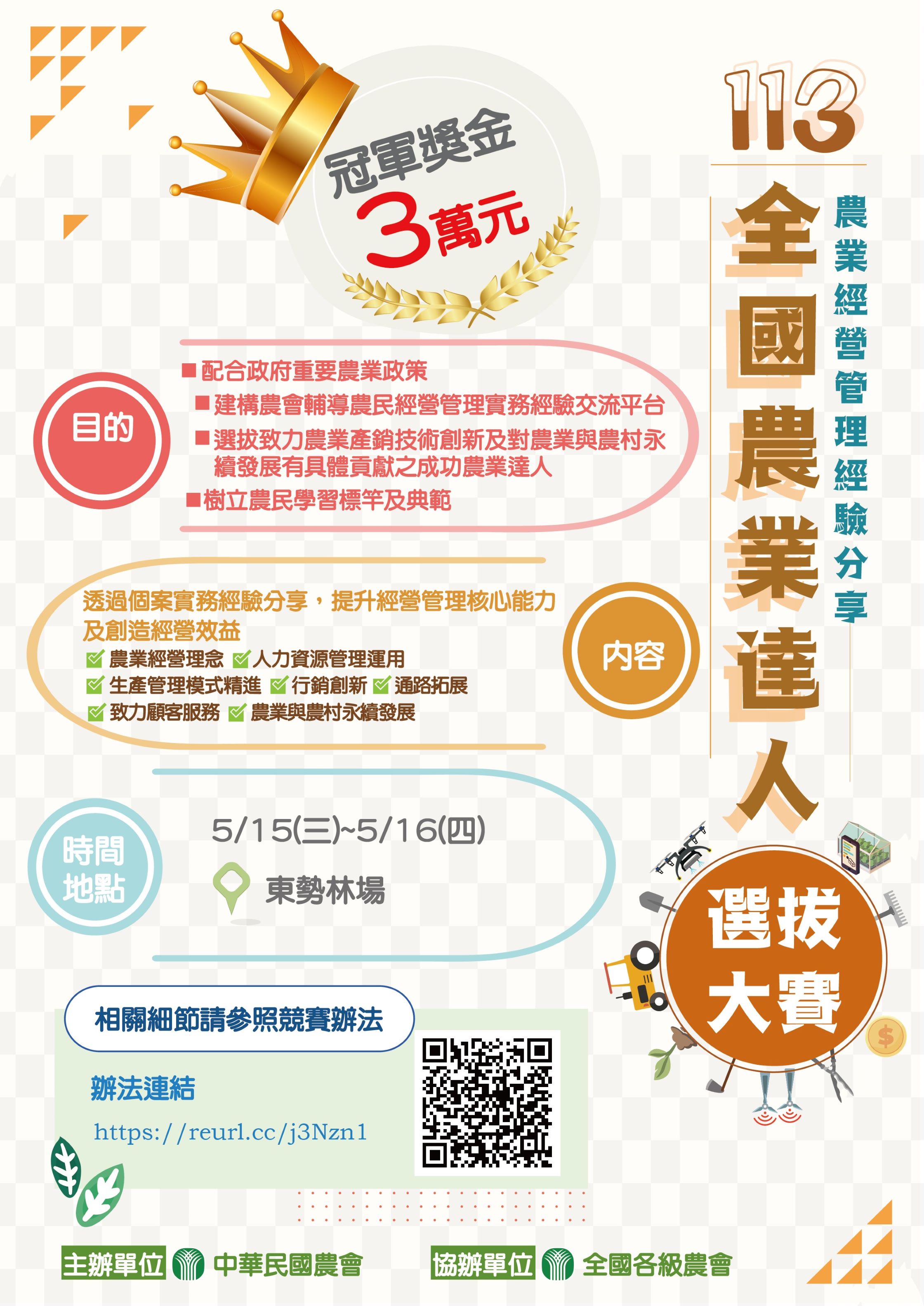 一、競賽目的:為配合政府重要農業政策及新農業創新推動方案,辦理全國農業達人選拔大賽,建構農會輔導農民經營管理實務經驗交流平台,選拔致力農業產銷技術創新及對農業與農村永續發展有具體貢獻之成功農業達人,樹立農民學習的標竿及典範,激發創新思考,讓經驗得以累積、擴散及應用,提高營農信心及提升農業產業競爭力,開創農業新契機,帶動農業永續發展。 二、主辦單位:中華民國農會。 三、協辦單位:直轄市及各縣(市)農會、所轄基層農會。 四、辦理日期:113年5月15日至16日(星期三至四)。 五、辦理地點:東勢林場。