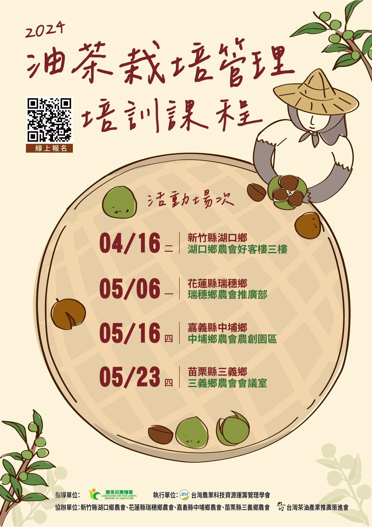 一、辦理目的: 為協助各地油茶產業強化田間栽培觀念,針對北中南東各產區需求規劃辦理主題性栽培管理課程,增進油茶栽培業者正確栽培相關知識,提升油茶產業原料的品質及產量。 二、報名方式:採網路報名,需於各場次前一週完成報名。 三、辦理單位: 指導單位:農業部農糧署 執行單位:台灣農業科技資源運籌管理學會 備註:課程簡章及相關資訊詳如附件