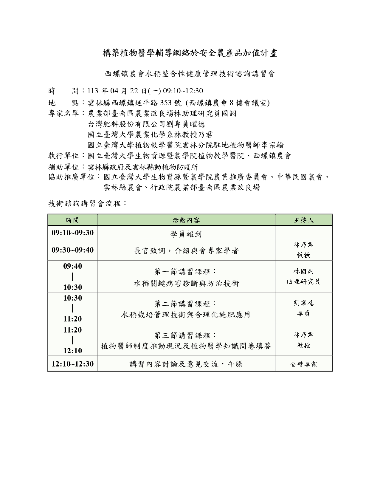 一、辦理時間:113年4月22日。 二、辦理地點:西螺鎮農會。