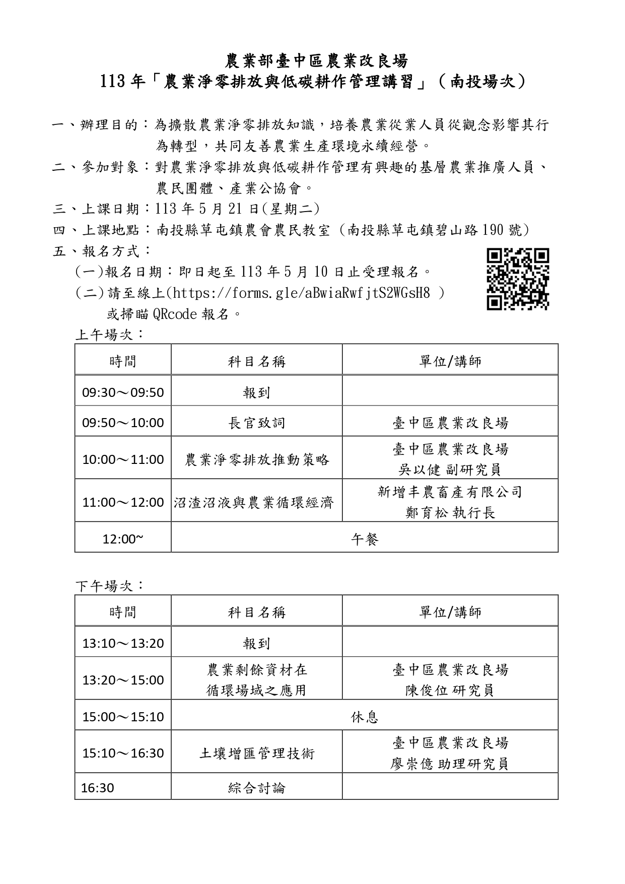 一、課程日期:5月21日。 二、報名期限:即日起至5月10日。 三、報名方式:網路報名 四、聯絡人:陳世芳副研究員(04-8523101轉410)。