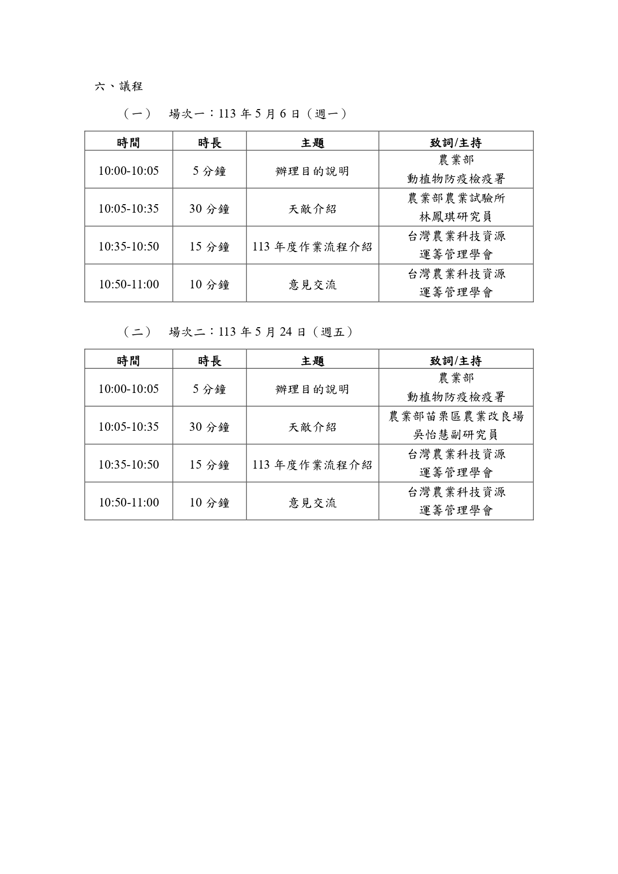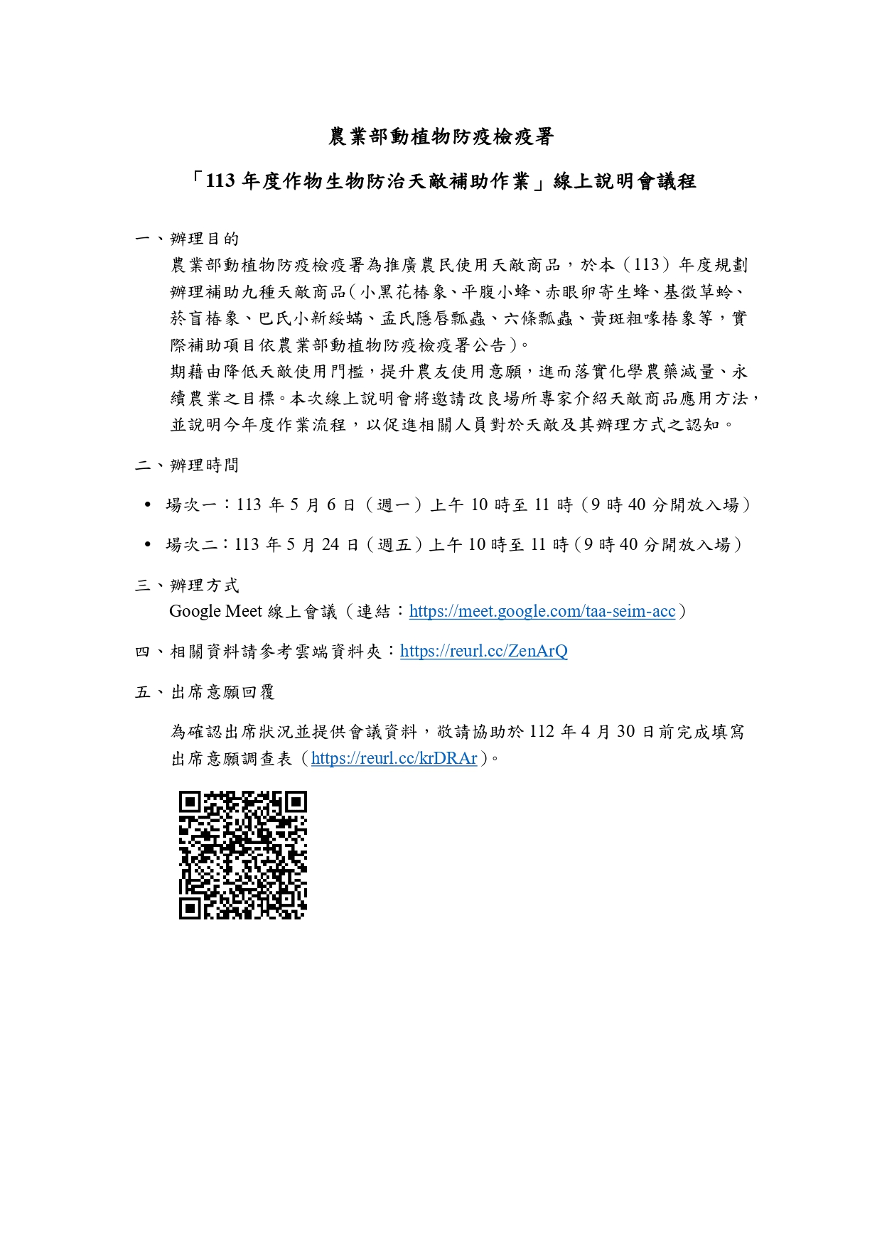 一、目的: 介紹作物生物防治天敵商品應用方法、補助作業執行流程與相關文件內容。 二、辦理場次及時間: (一)場次一,113年5月6日(週一)上午10時至11時。 (二)場次二,113年5月24日(週五)上午10時至11時。 四、會議地點:GoogleMeet線上會議(9時40分開放入場) 五、相關資訊請參閱農業部動植物防疫檢疫署網站,首頁>主要業務>植物防疫>植物防疫資訊>友善環境植物保護資材補助>作物生物防治天敵補助作業方式。 六、為確認出席狀況,敬請協助於113年4月30日前完成網路報名,與會時請以「單位-姓名」標示出席人員。