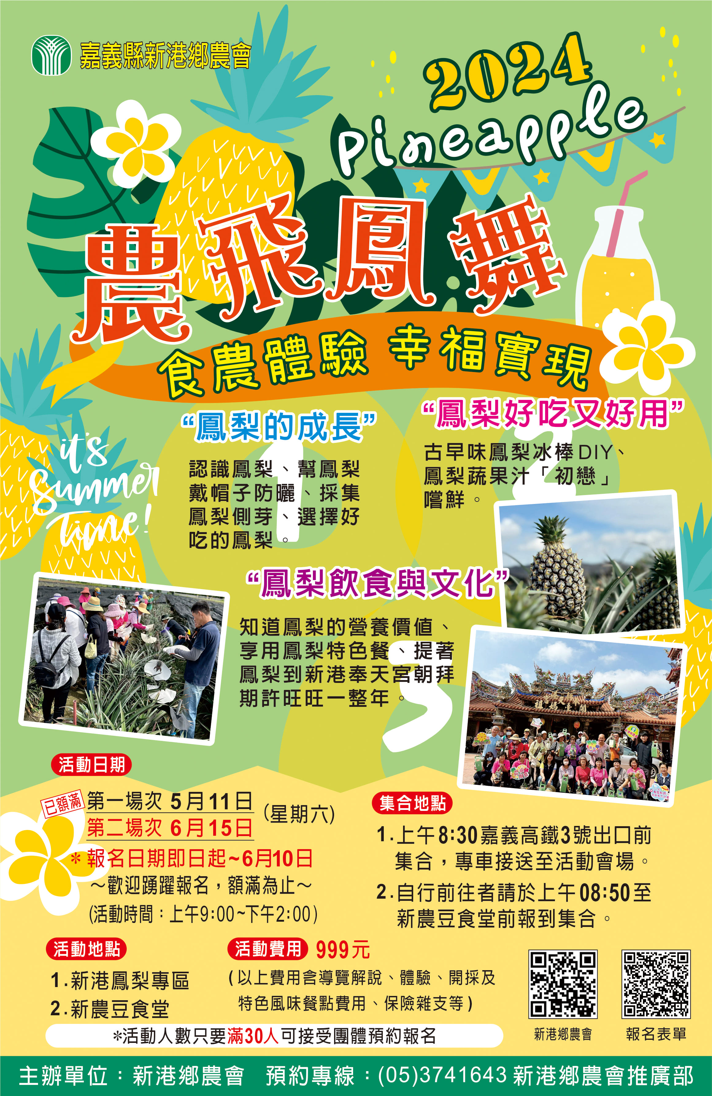 活動內容: ※鳳梨的成長 ※鳳梨好吃又好用 ※鳳梨飲食與文化 活動日期:5月11日(六)已額滿 6月15日(六) 活動地點:新港鳳梨專區、新農豆食堂 聯絡資訊:新港鄉農會推廣部 05-3741643 主辦單位:新港鄉農會