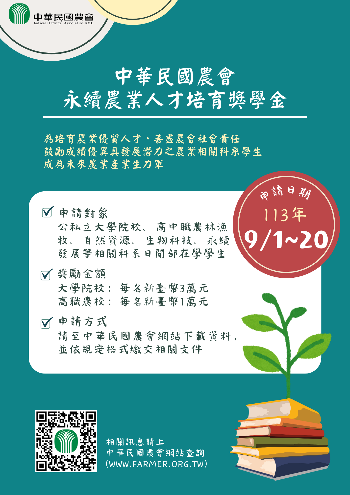 一、獎勵對象及內容: (一)本獎學金申請對象為具中華民國國民身分且經教育部認可之各公私立大學院校、高中職農林漁牧、自然資源、生物科技、永續發展等相關科系日間部在學學生。 (二)每年獎勵金額及名額如下: 1.大學院校:每名新臺幣3萬元,共60名。 2.高職農校:每名新臺幣1萬元,共100名。 二、申請資格: (一)凡符合第二條規定之大學院校二年級至四年級或高中職二年級至三年級在學生,其前一學年上、下學期學業平均成績及德行成績分別皆達八十分以上,且無任何學科不及格得申請。 若無德行成績評定分數者,其德行評量之獎懲紀錄不得有小過(含)以上之處分。學校未定獎懲換算基準者,累計警告3次或申誡3次視為小過1次。 (二)為擴大培育農業優質人才,本獎學金依大學院校及高職農校之獎勵對象分別提供一次受領機會,曾獲選者不得再提出申請。 三、申請期間:113年9月1日至9月20日。 四、申請辦法與申請表單下載連結:https://reurl.cc/RqLe9g