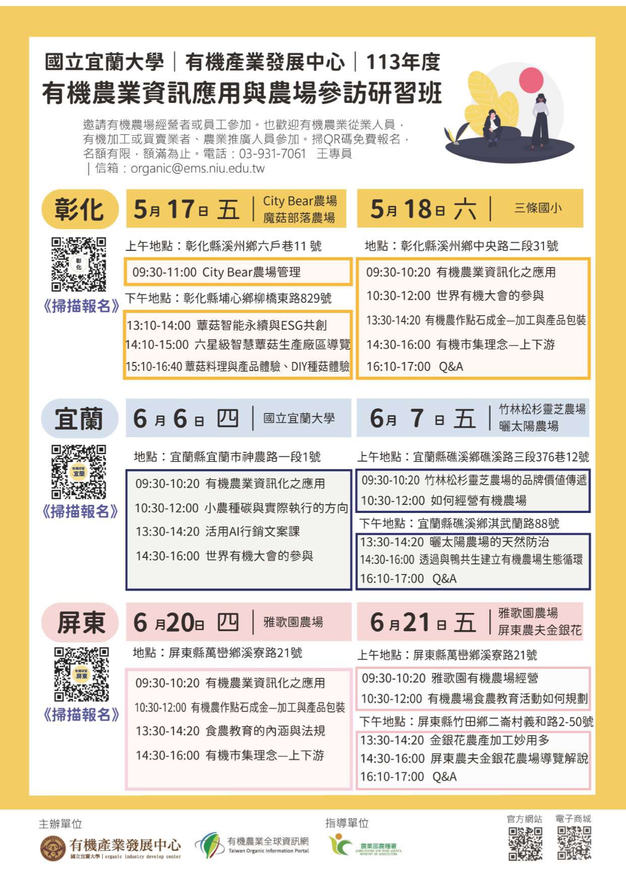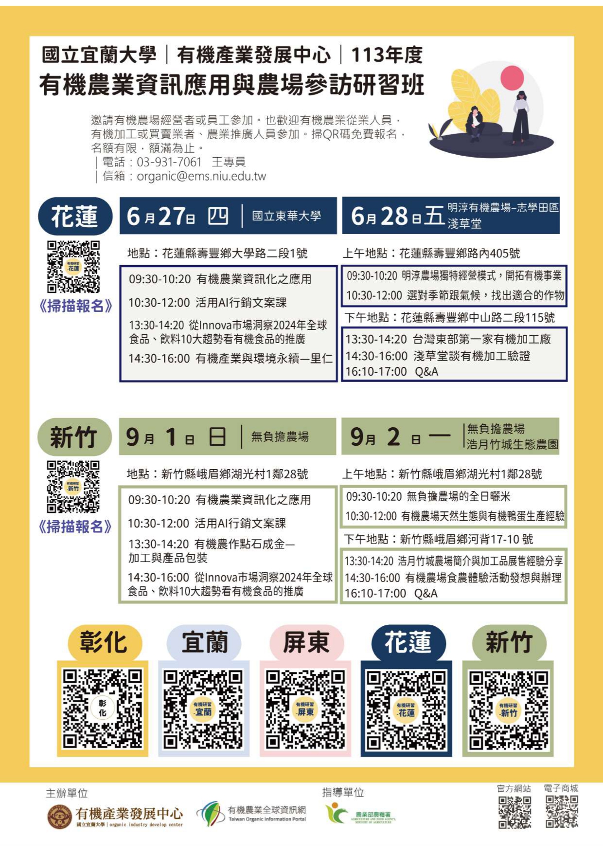 國立宜蘭大學辦理「113年有機農業資訊應用與農場參訪研習班課程」相關資訊