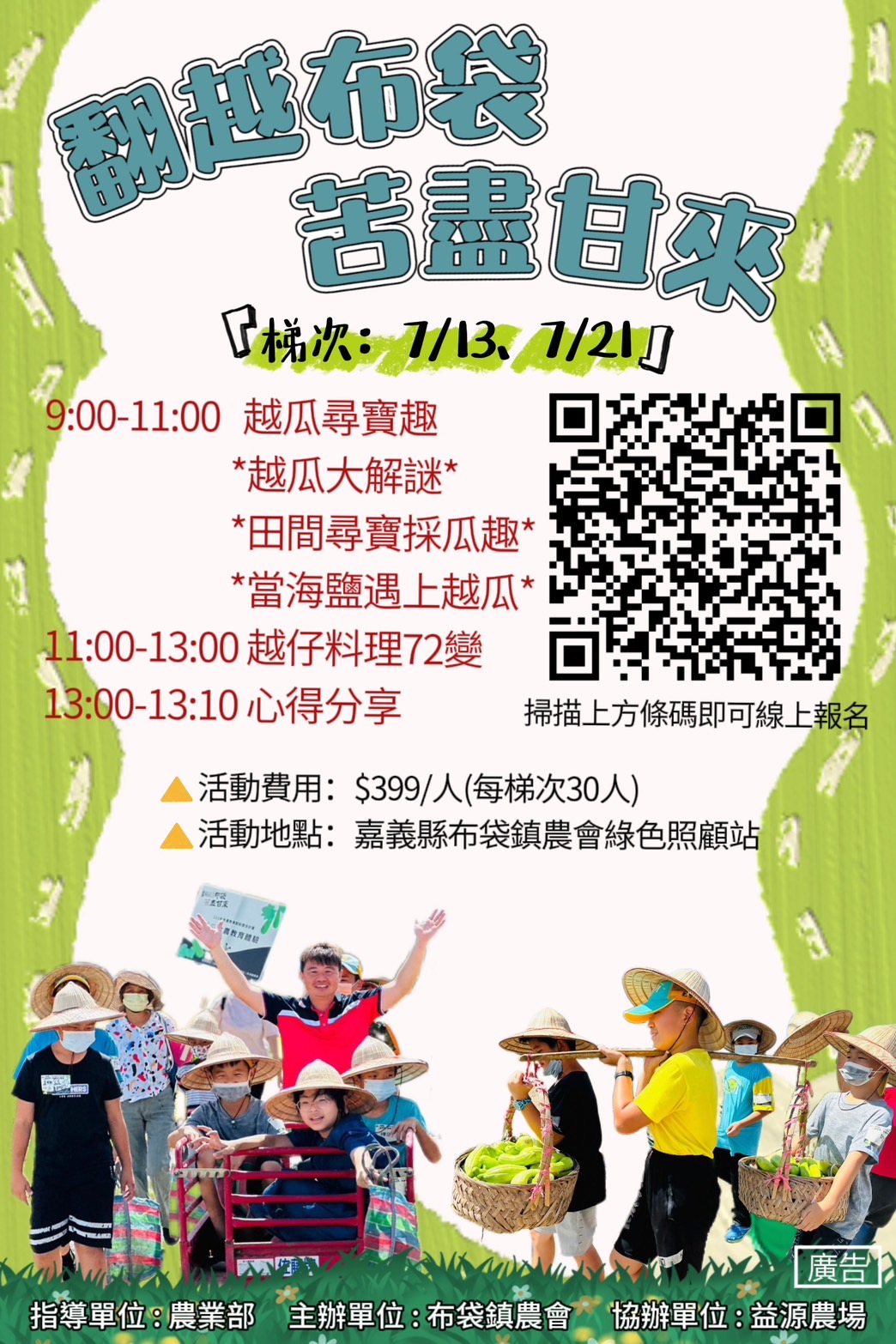 一、活動日期:7/13、7/21 二、活動內容:越瓜尋寶趣、越瓜大解謎、田間尋寶採瓜趣、當海鹽遇上越瓜、越仔料理72變 三、活動費用:399元/人 四、活動地點:嘉義縣布袋鎮農會綠色照顧站 五、活動報名資訊請掃DM QRcode填資料報名。 指導單位:農業部 主辦單位:布袋鎮農會 協辦單位:益源農場