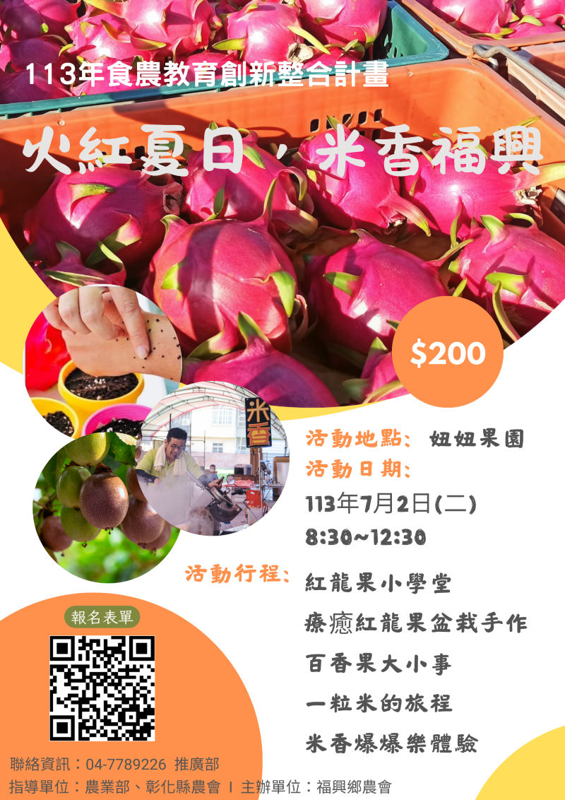 活動日期:7月2日(星期二) 活動地點:妞妞果園 活動行程:紅龍果小學堂、療癒紅龍果盆栽手作、百香果大小事、一粒米的旅程、米香爆爆樂體驗 聯絡資訊:04-7789226 推廣部 指導單位:農業部、彰化縣農會 主辦單位:福興鄉農會