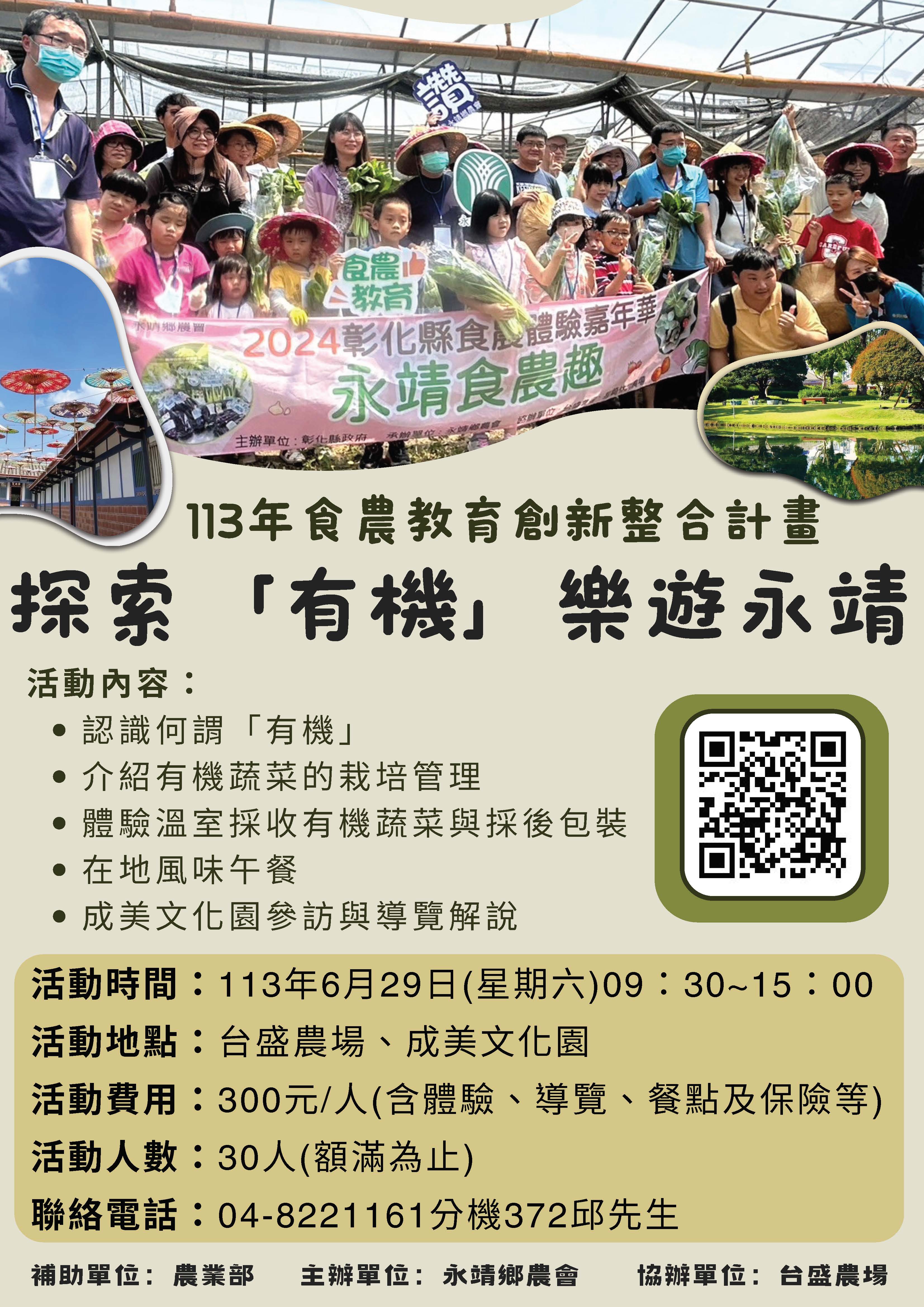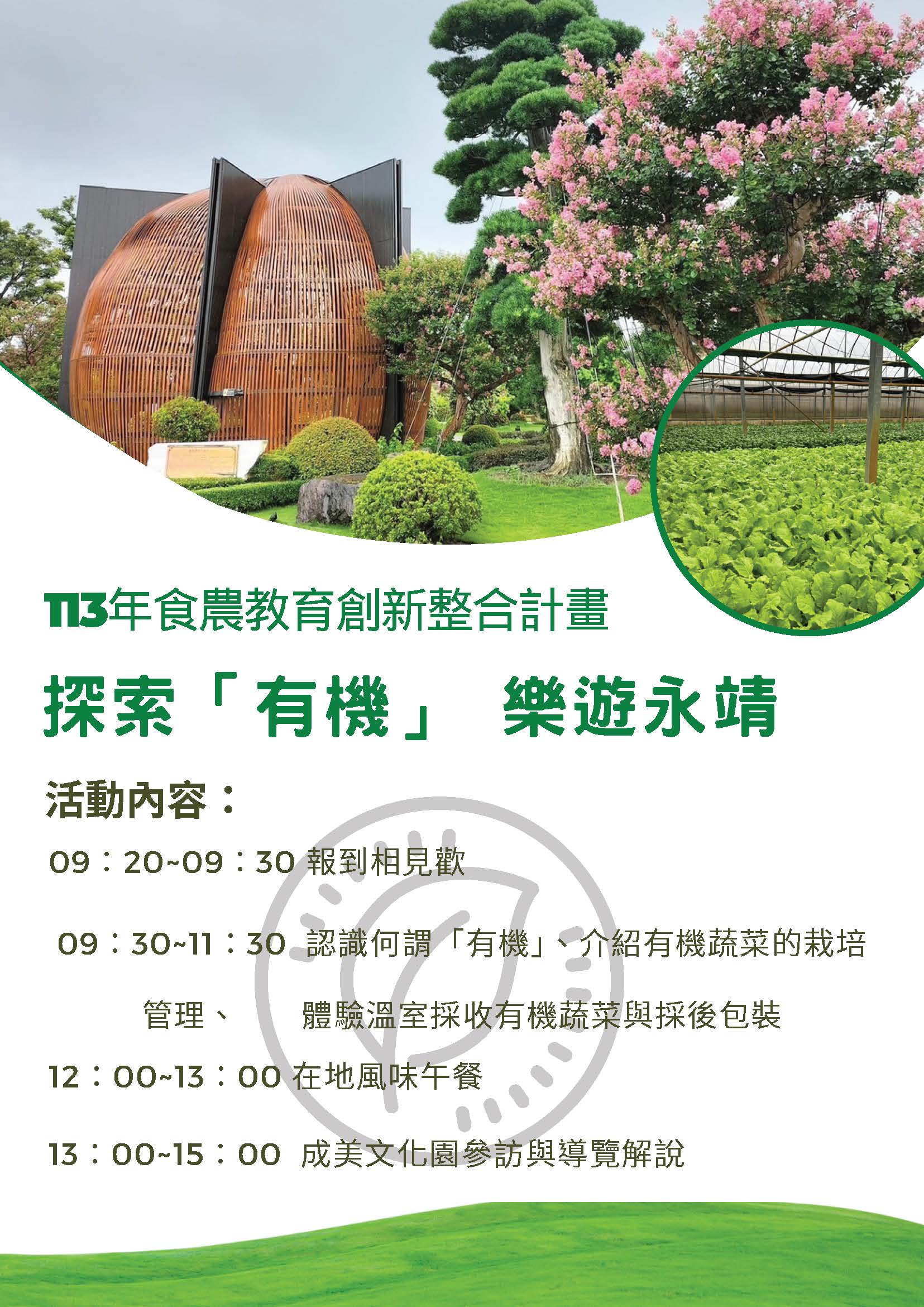 活動時間:6月29日(星期六) 活動地點:台盛農場、成美文化園 活動內容:何謂「有機」、有機蔬菜栽培管理、有機蔬菜採收及包裝、成美文化園參訪導覽解說 聯絡電話:04-8221161分機372 邱先生 補助單位:農業部 主辦單位:永靖鄉農會 協辦單位:台盛農場