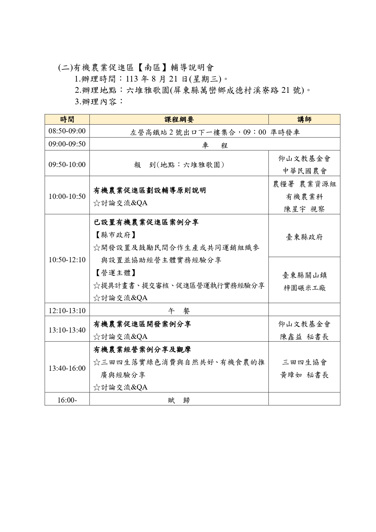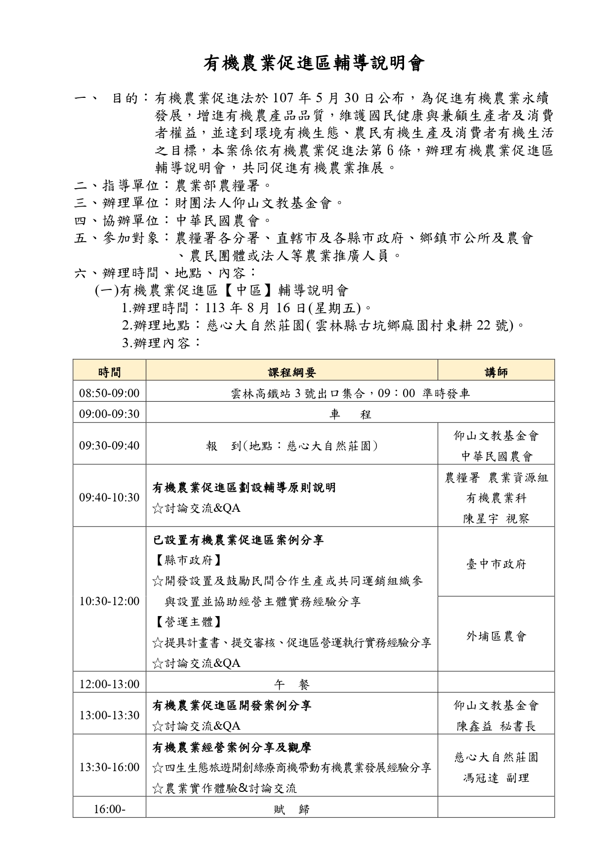 一、目的:有機農業促進法於107年5月30日公布,為促進有機農業永續發展,增進有機農產品品質,維護國民健康與兼顧生產者及消費者權益,並達到環境有機生態、農民有機生產及消費者有機生活之目標,本案係依有機農業促進法第6條,辦理有機農業促進區輔導說明會,共同促進有機農業推展。 二、指導單位:農業部農糧署。 三、辦理單位:財團法人仰山文教基金會。 四、協辦單位:中華民國農會。 五、參加對象:農糧署各分署、直轄市及各縣市政府、鄉鎮市公所及農會、農民團體或法人等農業推廣人員。