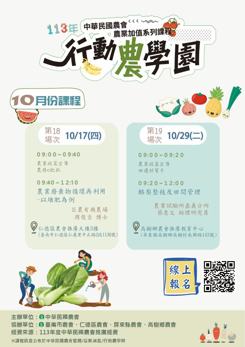 一、課程目的: 服務農民是農會存在的核心價值,為精進農民農業專業知識、技術以及因應全球淨零排碳、農業永續,開放各農會以在地主要作物提升產銷相關農業技術需求提案,由本會安排至現地辦理系列課程,藉由理論及實作課程,協助從農工作與時俱並促進現代化農業發展。 二、參加對象:產銷班班員、農民、青年農民、農會人員或對從事農業有興趣之民眾。 三、報名方式:採線上報名或報名表傳真報名 04-24854573。