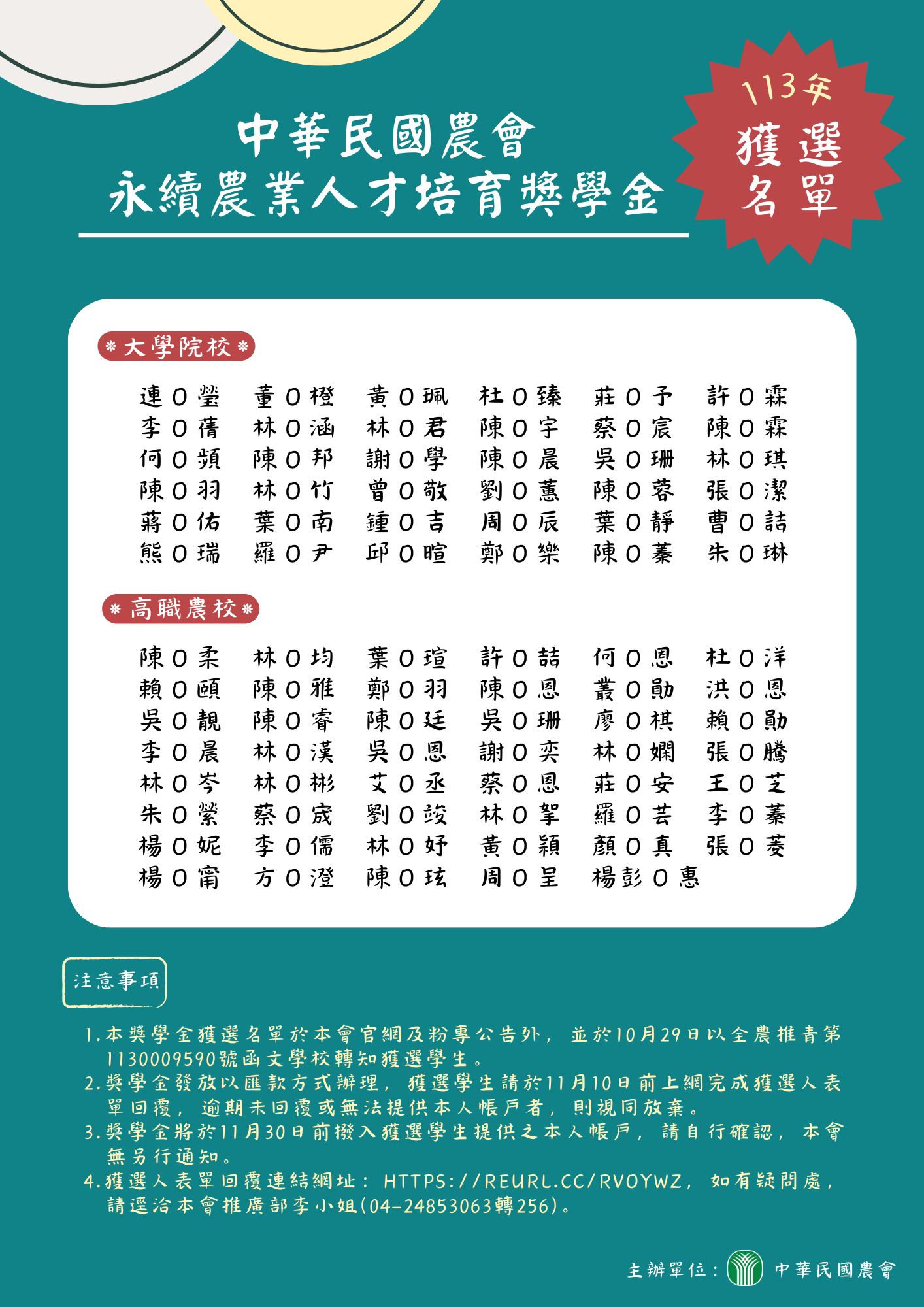 注意事項: 1.本獎學金獲選名單於本會官網及粉專公告外,並於10月29日以全農推青第1130009590號函文學校轉知。 2.獎學金發放以匯款方式辦理,獲選學生請於11月10日前上網完成獲選人表單回覆,逾期未回覆或無法提供本人帳戶者,則視同放棄。 3.獎學金將於11月30日前撥入獲選學生提供之本人帳戶,請自行確認,本會無另行通知。 4.獲選人表單回覆連結網址:https://reurl.cc/rvOYWZ,如有疑問之處,請逕洽本會推廣部李小姐(04-24853063轉256)。