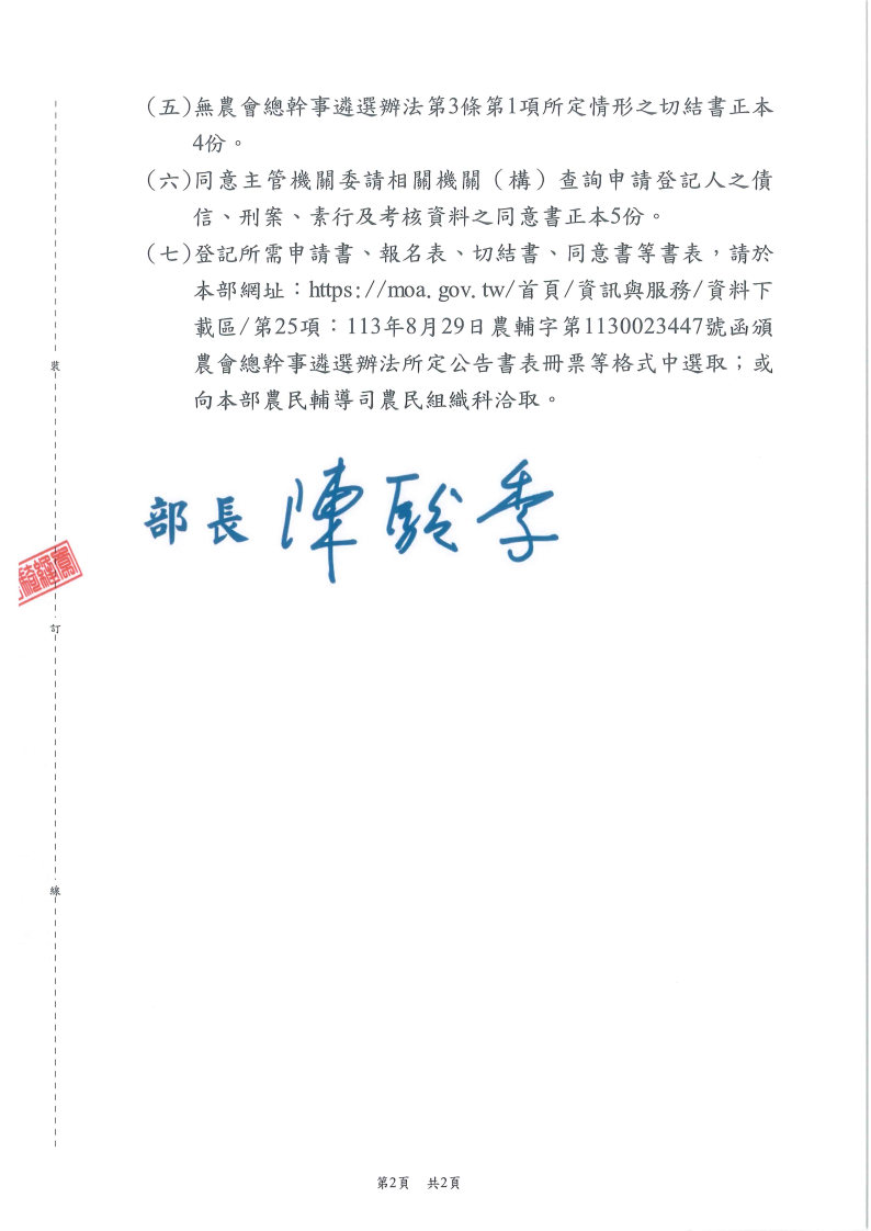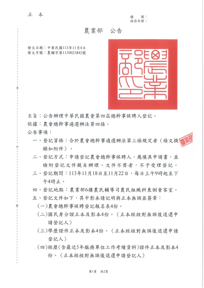 公告辦理中華民國農會第四屆總幹事候聘人登記