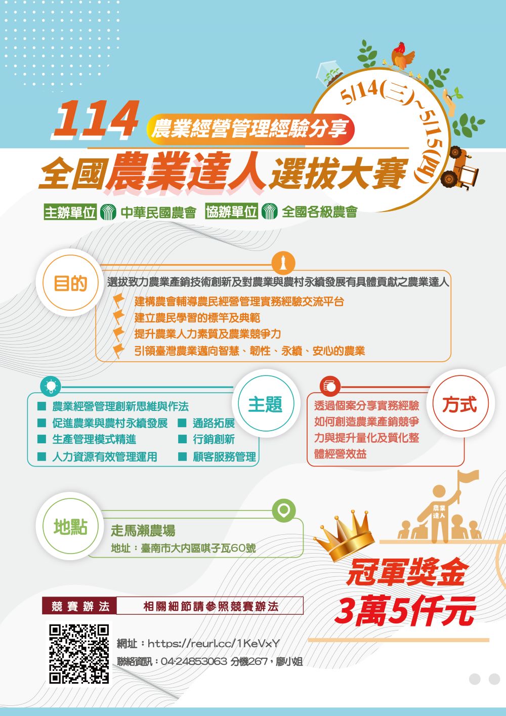 辦理日期:114年5月14日至15日(星期三至四)。 辦理地點:臺南市農會走馬瀨農場(臺南市大內區二溪里唭子瓦60號)。