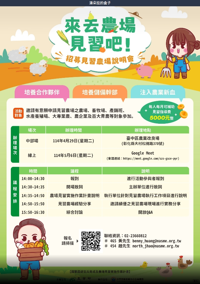 二、本案招募見習農場說明會訂於114年4月29日(中部場)及5月6日(線上場)各辦理1場次,旨在說明見習農場實施作業計畫與提供見習農場經驗分享,並協助有意願之農場、畜牧場、產銷班、水產養殖場、大專業農、農企業及百大青農等申請成為見習農場。