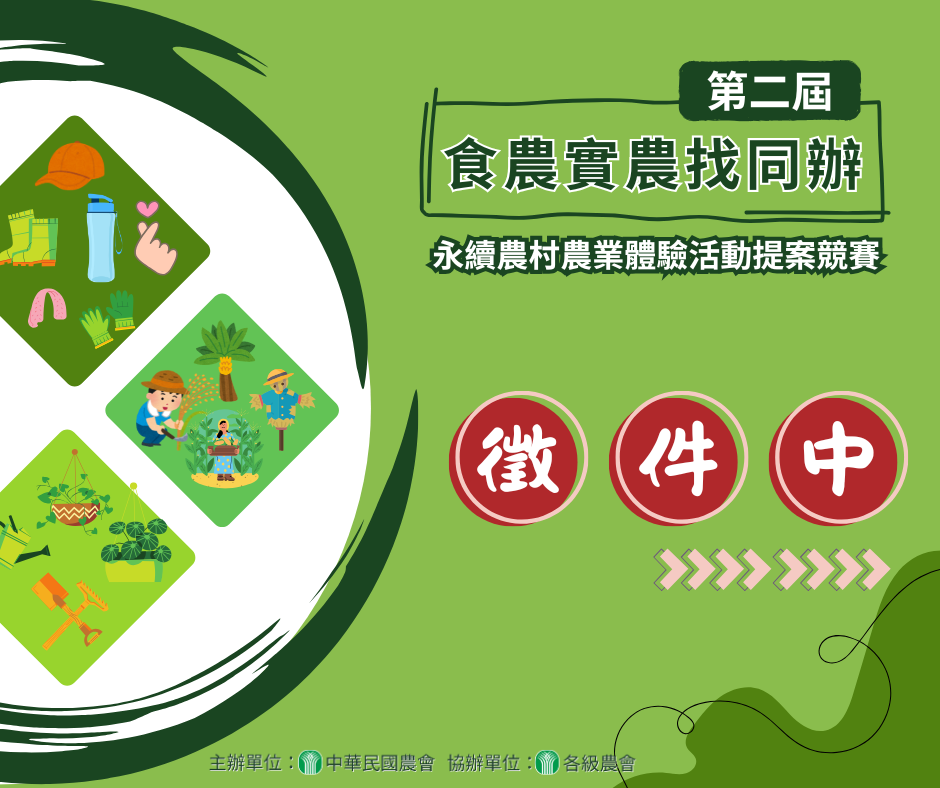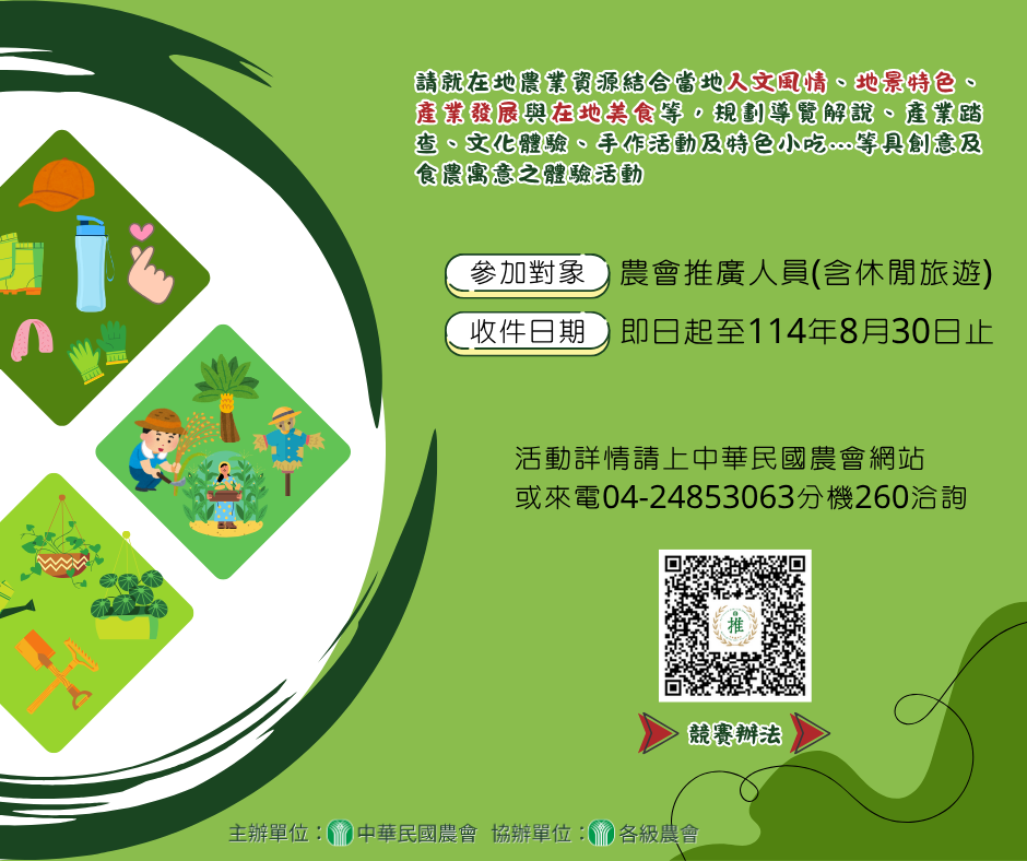 一、競賽相關期程: (一)收件日期:即日起至114年8月30日止。 (二)評選日期:暫定114年9月15日。 (三)獲選公告:暫定114年9月18日。 二、主題內容:請參賽者就農會所在地之農業資源,結合當地人文風情、地景特色、產業發展與在地美食,自行設定活動主題,規劃具創意且富含食農意涵之一日體驗活動(建議時數6小時)。活動內容可視主題與資源彈性規劃,可涵蓋導覽解說、產業踏查、文化體驗、手作活動及特色小吃等。 三、送件方式: (一)參賽者請於8月30日前依所附格式,將提案表格及相關參考資料彙整壓縮檔,以電子郵件方式mail至yao204668@gmail.com並來電04-24853063#260確認。 (二)提案資料檔名請設定為農會-活動主題(例如:魚池鄉農會-香菇王國 魚池跳炭戈~)。 四、提案競賽活動諮詢:04-24853063分機260。