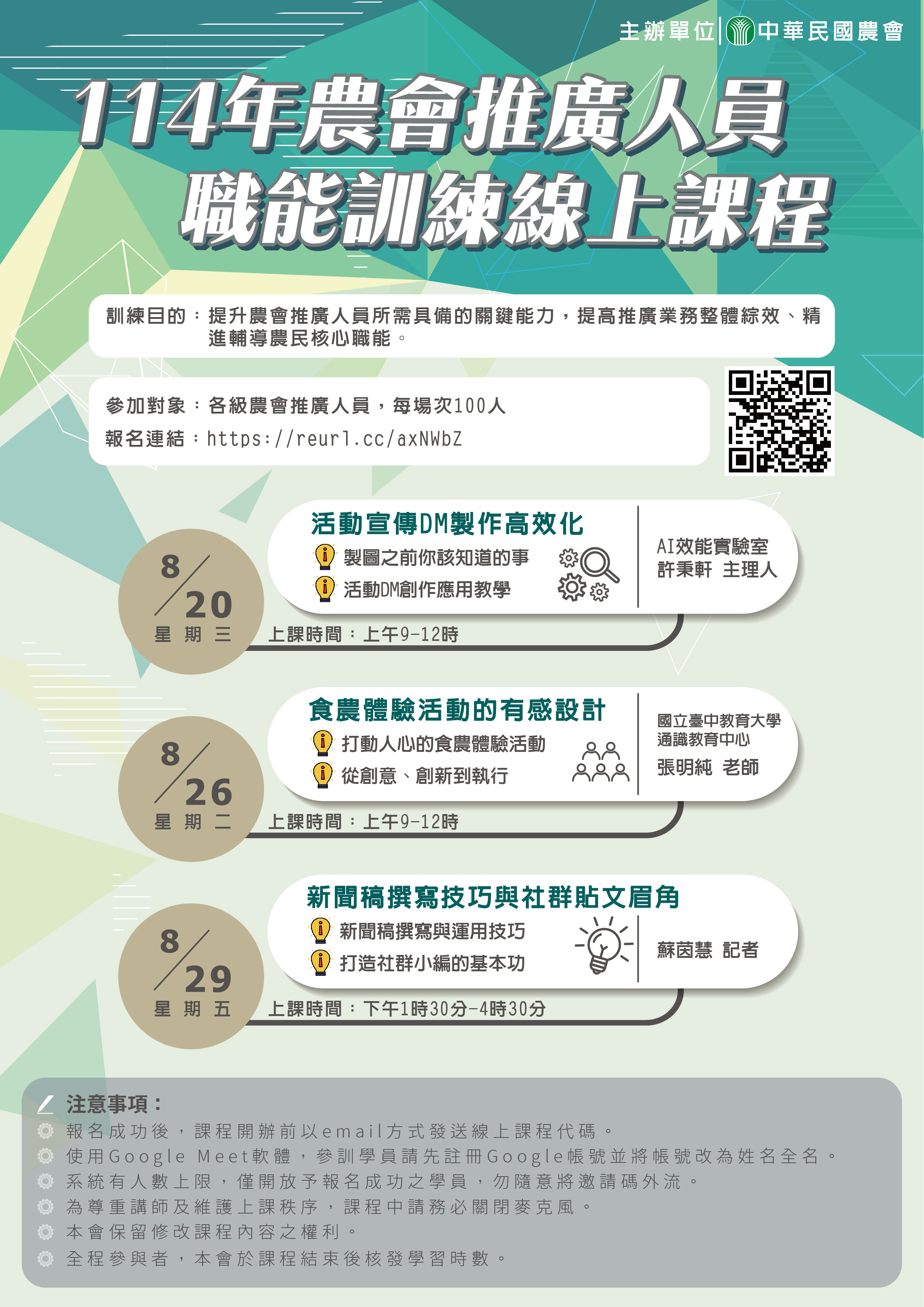 【114年農會推廣人員職能訓練】線上系列課程開放報名囉! 為提升農會推廣人員所需具備的關鍵能力 提高農業推廣業務整體綜效、精進輔導農民核心職能💪 本會辦理相關線上系列課程 想提升活動DM產出效能、設計有共鳴的食農體驗活動及對活動新聞稿或社群貼文苦惱的你🫵 快點手速來報名參加吧! ★參加對象👥: 各級農會推廣人員,每單位正取1名、備取1名,每場次上限100人。(本會保留名單篩選權利)。 ★課程時間及主題: 🎯第1場次:8月20日(星期三)上午9-12時,活動宣傳DM製作高效化。 🎯第2場次:8月26日(星期二)上午9-12時,食農體驗活動的有感設計。 🎯第3場次:8月29日(星期五)下午1時30分-4時30分,新聞稿撰寫技巧與社群貼文眉角。 ★報名網址:https://reurl.cc/axNWbZ #中華民國農會 #農會推廣人員職能訓練 #線上課程