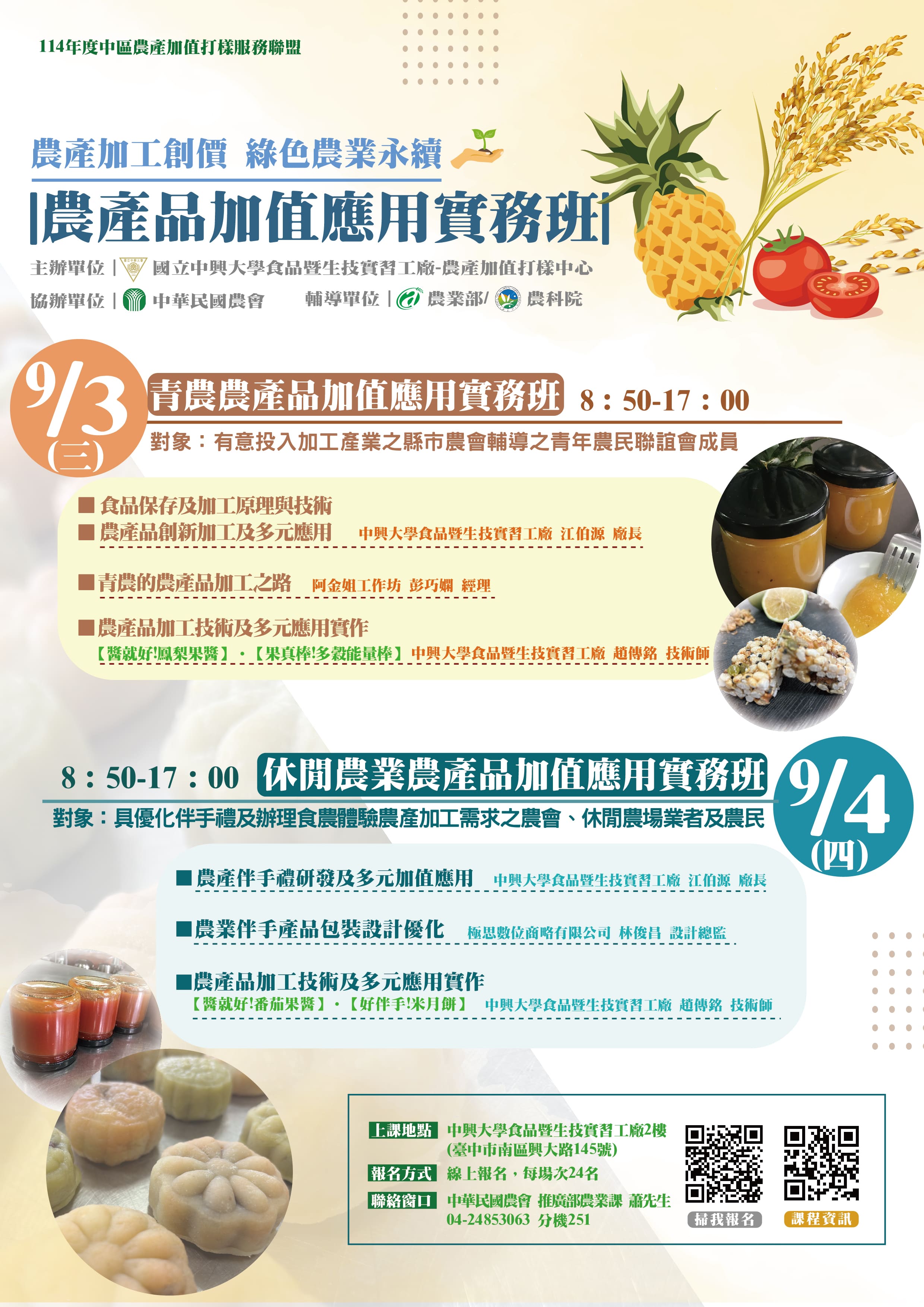一、訓練目的:為協助政府推動農產品生產到初級加工一元化管理制度、青農輔導政策及落實食農教育在生活中實踐,分別以青農及休閒農業經營者為輔導對象,由國立中興大學與本會合辦2場次「農產品加值應用實務班」,協助青農以國產溯源原料進行小規模加工,產製符合衛生安全法規之優質農產品;協助休閒農業經營者在循環經濟意識抬頭下優化伴手禮包裝設計及研發產品並深化食農體驗活動內涵,推廣消費者安心、安全、衛生的國產溯源農產伴手產品。 二、主辦單位:國立中興大學食品暨生技實習工廠-農產加值打樣中心 三、協辦單位:中華民國農會 ; 輔導單位:農業部、農科院 四、辦理地點:國立中興大學食品暨生技實習工廠2樓 (臺中市南區興大路145號)