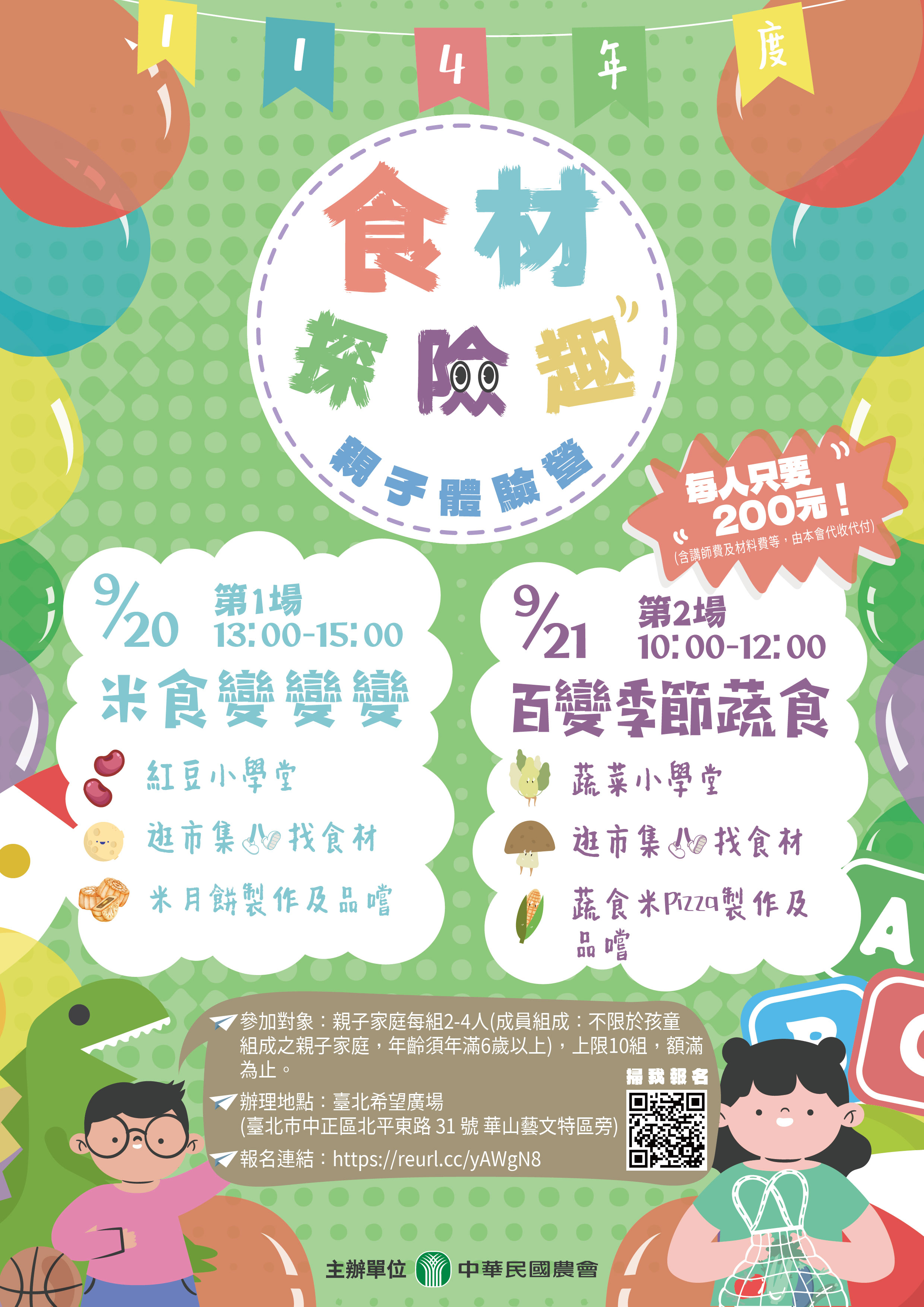 👨👩👧👦114年度食材探險趣親子體驗營(二)開放報名囉👨👩👧👦 🌞透過國產農產知識小學堂、逛市集找食材及親子共廚手做料理等寓教於樂的親子食農體驗活動,讓消費者認識農產品標章、標示並推廣家庭選用國產在地優質食材及珍惜憫農的餐桌觀念,扎根「吃在地、享當季」食農教育理念,並縮短產地到餐桌距離以降低食物里程。 ⏰活動日期 🍴第1場次➡️食材探險趣-米食變變變 9月20日(六) 13:00~15:00 🍴第2場次➡️食材探險趣-百變季節蔬食 9月21日(日) 10:00~12:00 🗺活動地點:臺北希望廣場(臺北市中正區北平東路 31 號 華山藝文特區旁) 👥參加對象 親子家庭每組2-4人(成員組成:不限於孩童組成之親子家庭,年齡須年滿6歲以上),上限10組,額滿為止。 ✨想加深親子互動又不知道該往哪裡去?想更加了解國產農產小知識?超值的優惠體驗就在這,名額有限,報完為止,大家趕快手刀報名起來❗❗❗ 📲活動報名連結➡️ https://reurl.cc/yAWgN8 #中華民國農會 #臺北希望廣場 #食材探險趣 #親子體驗