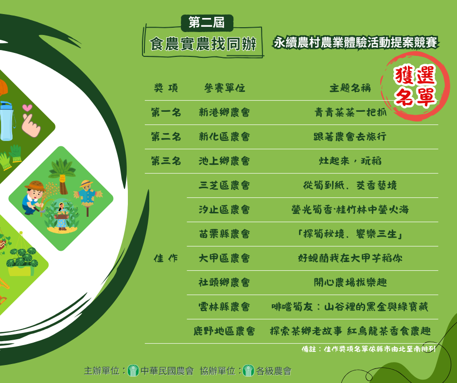 第二屆「食農實農找同辦」永續農村農業體驗活動提案競賽獲選名單