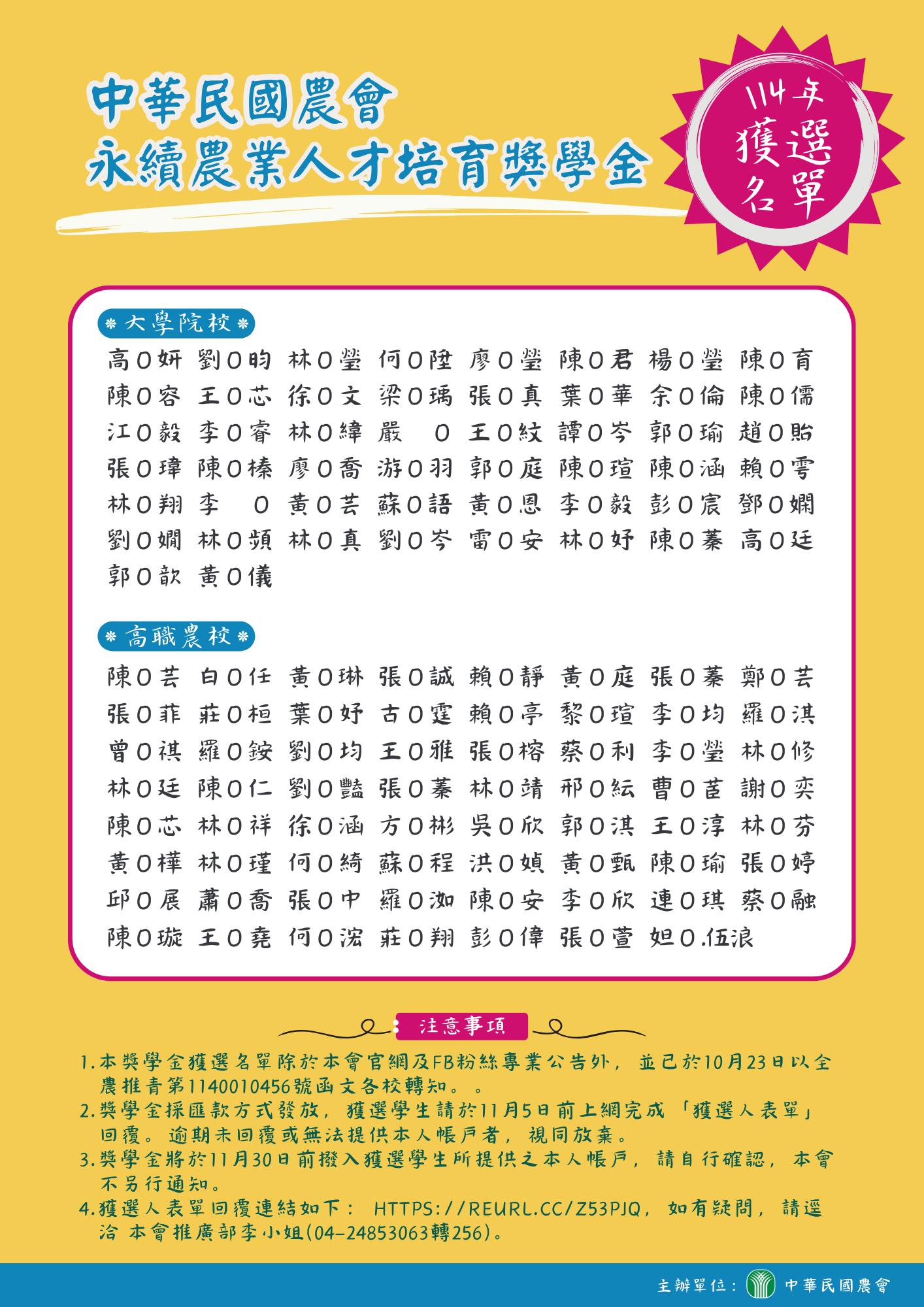 114年度「中華民國農會永續農業人才培育獎學金」獲選名單出爐啦!