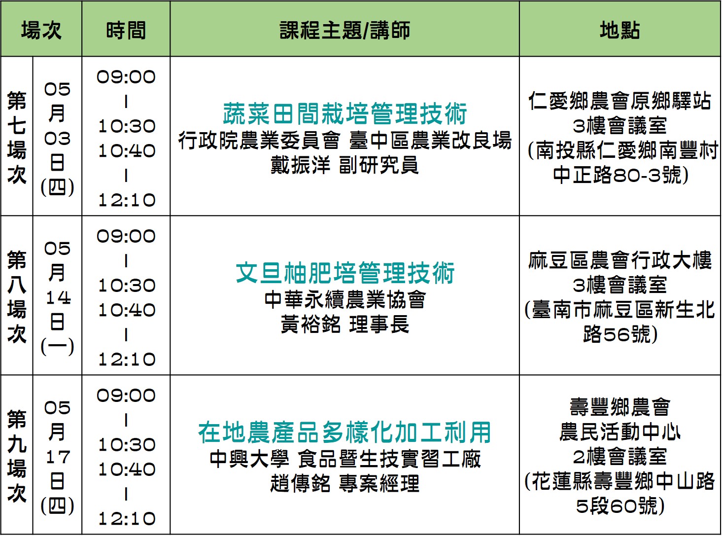 5月份系列講座來到南投、臺南及花蓮,仁愛及麻豆邀請專家學者講授蔬菜及果樹(文旦柚)田間栽培管理與肥培管理技術;花蓮壽豐則邀請擅長食品加工實作講師,教授學員利用在地農產品作多元加工利用,增加農產品價值及提高農民收入,竭誠歡迎大家踴躍參與! 主辦單位:中華民國農會 協辦單位:南投縣農會、臺南市農會、花蓮縣農會、仁愛鄉農會、麻豆區農會 、壽豐鄉農會 經費來源:107年度中華民國農會推廣經費 線上報名:https://goo.gl/TKk85V