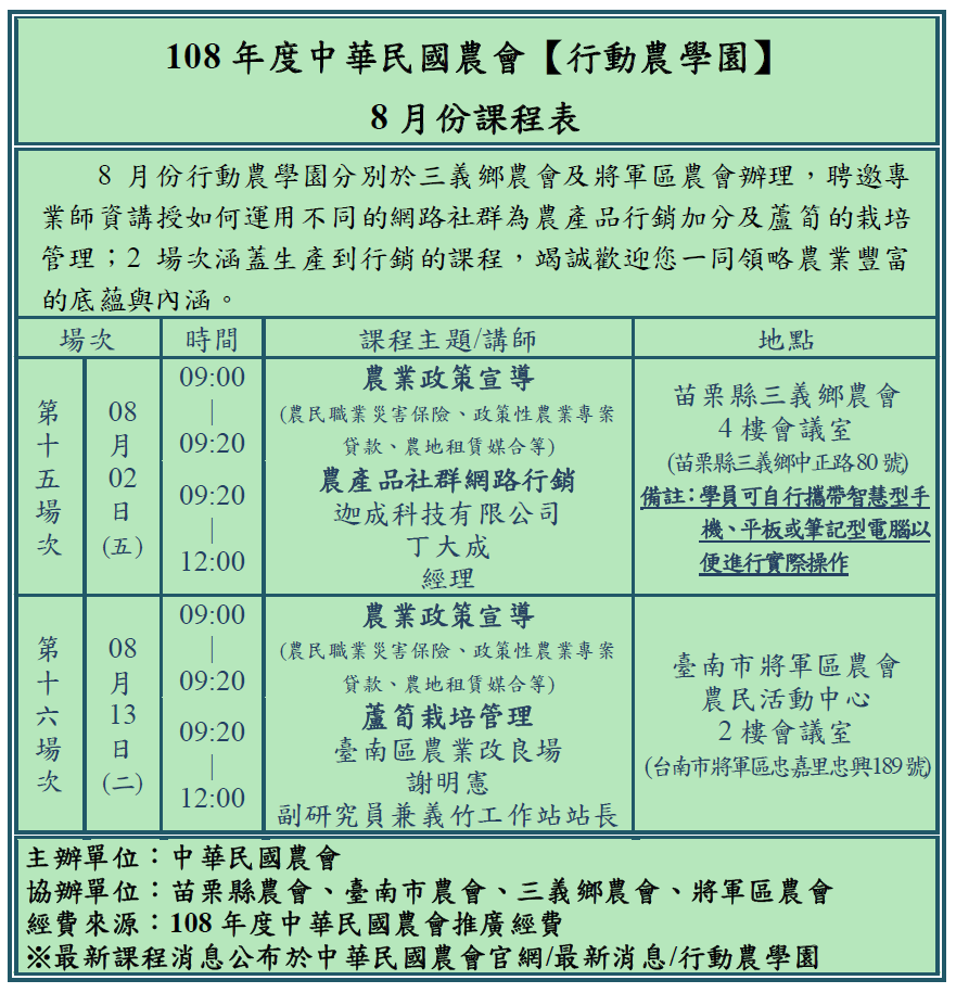 8月份行動農學園分別於三義鄉農會及將軍區農會辦理,聘邀專業師資講授如何運用不同的網路社群為農產品行銷加分及蘆筍的栽培管理;2場次涵蓋生產到行銷的課程,竭誠歡迎您一同領略農業豐富的底蘊與內涵。 線上報名:https://reurl.cc/l65nq