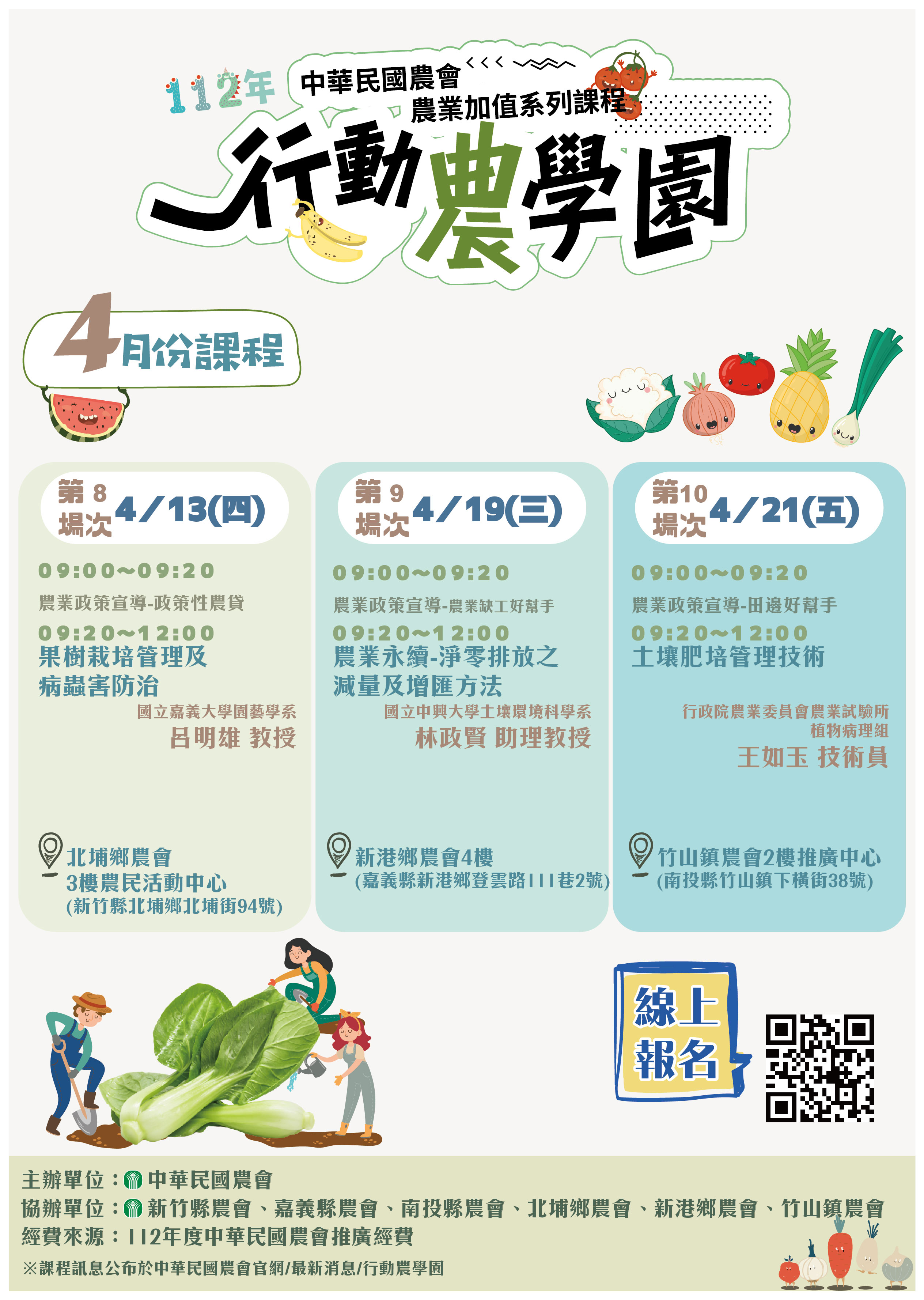 【行動農學園】4月份開放報名! 發佈日期:2023/05/23 【行動農學園】4月份開放報名!?????? 請大家跟著我們的行列一同領略農業豐富的底蘊與內涵,精進農業知識與技術,因應全球淨零排碳、農業永續,協助從農工作與時俱進。 參加對象: 產銷班班員、農民、青農、農會人員或對從事農業有興趣者。 課程時間與地點: 第八場次:4月13日(星期四)09:00-12:00,果樹栽培管理及病蟲害防治。 第九場次:4月19日(星期三)09:00-12:00,農業永續-淨零排放之減量及增匯方法。 第十場次:4月21日(星期五)09:00-12:00,土壤肥培管理技術。 線上報名及相關注意事項:https://reurl.cc/zADqmp #中華民國農會 #行動農學園 #北埔鄉農會 #新港鄉農會 #竹山鎮農會 #果樹栽培管理及病蟲害防治 #農業永續淨零排放之減量及增匯方法 #土壤肥培管理技術