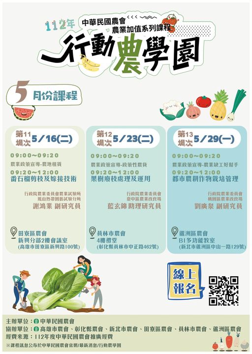 【行動農學園】5月份開放報名! 請大家跟著我們的行列一同領略農業豐富的底蘊與內涵,精進農業知識與技術,因應全球淨零排碳、農業永續,協助從農工作與時俱進。 參加對象: 產銷班班員、農民、青農、農會人員或對從事農業有興趣者。 課程時間: 第11場次:5月16日(二)09:00-12:00,番石榴剪枝及嫁接技術。 第12場次:5月23日(二)09:00-12:00,果樹廢枝處理及運用。 第13場次:5月29日(一)09:00-12:00,都市農耕作物栽培管理。 線上報名及相關注意事項:https://reurl.cc/vkOG3j #中華民國農會 #高雄市農會 #田寮區農會 #彰化縣農會 #員林市農會 #新北市農會 #蘆洲區農會