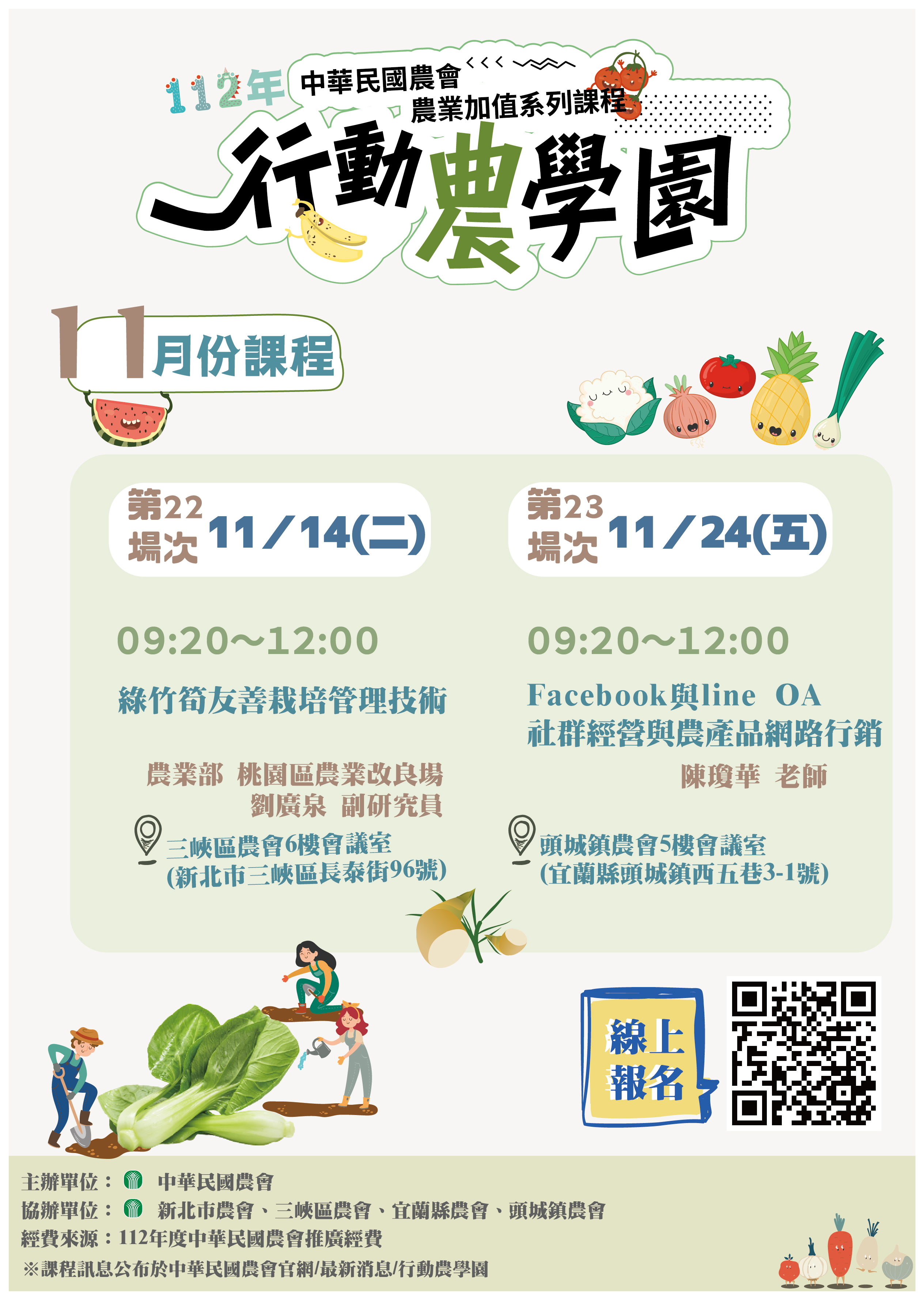 一、場次、日期、課程主題、時間及地點: (一)第二十二場次:11月14日(星期二)「綠竹筍友善栽培管理技術」,9:20-12:00,三峽區農會6樓會議室。 (二)第二十三場次:11月24日(星期五)「Facebook與line OA 社群經營與農產品網路行銷」,9:20-12:00,頭城鎮農會5樓會議室。 二、參加對象:產銷班班員、農民、青年農民、農會人員或對從事農業有興趣之民眾(額滿為止)。
