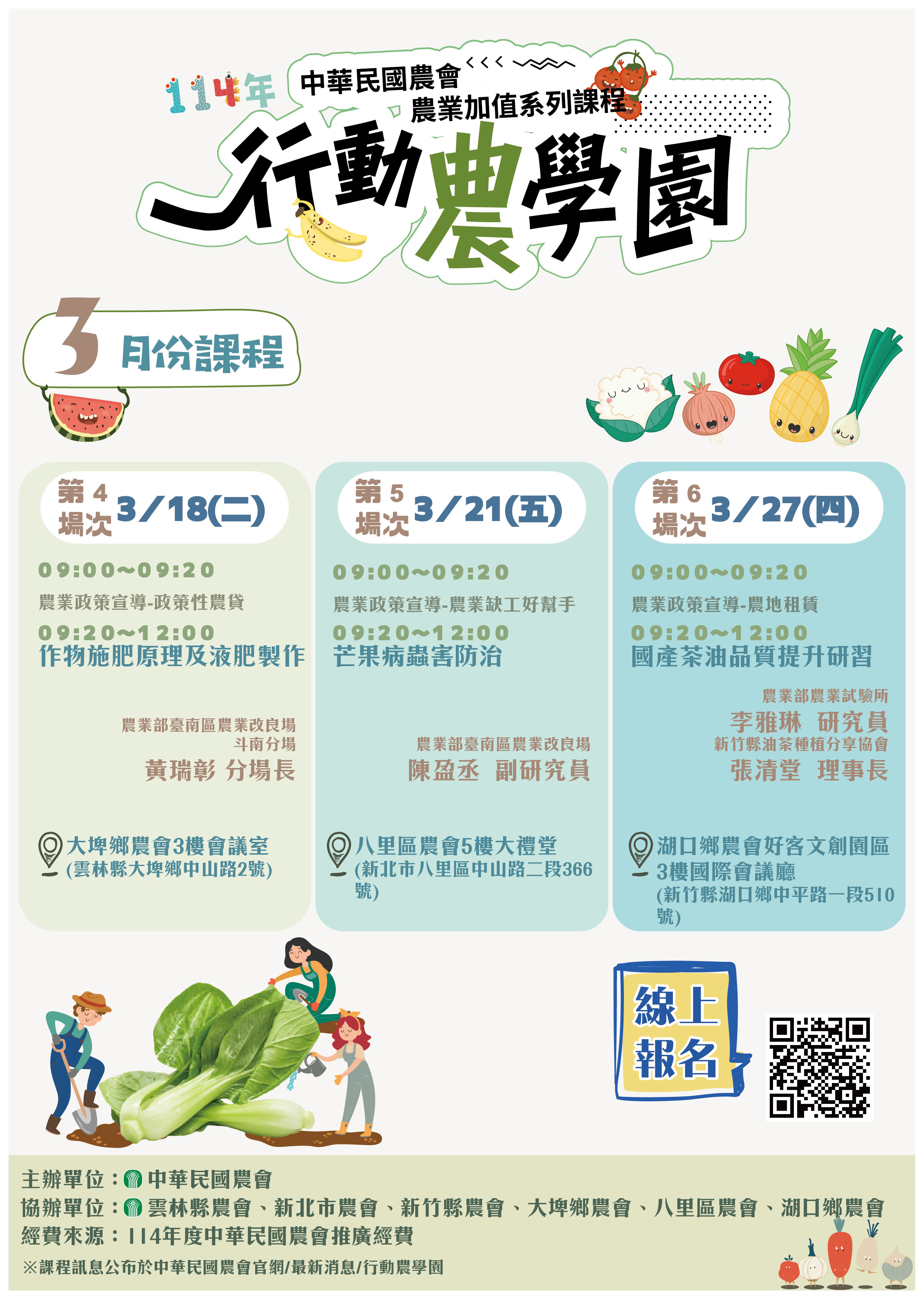 中華民國農會農業加值系列課程《行動農學園》 🌳114年3月份課程開始報名囉!🌳 👨🏫課程目的: 農業知識的傳遞是奠定農業發展的基石,為服務農民及精進農民生產技術及提升產業能力以及配合政府推動農業政策行動策略,本會自105年起開辦「行動農學園」系列課程,開放各農會以在地農民課程需求提案辦理,與在地農會共同協助農民從農工作與時俱進。 👥參加對象: 產銷班班員、農民、青農、農會人員或對從事農業有興趣者。 ⏰課程時間: ★第四場次「作物施肥原理及液肥製作」:3月18日(星期二)09:00-12:00,大埤鄉農會3樓會議室。 ★第五場次「芒果病蟲害防治」:3月21日(星期五)09:00-12:00,八里區農會5樓大禮堂。 ★第六場次「國產茶油品質提升研習」:3月27日(星期四)09:00-12:00,湖口鄉農會好客文創園區3樓國際會議廳。 💻報名方式:採線上報名或報名表傳真報名 04-24854573。 👉線上報名:https://reurl.cc/5Dm8Kn #中華民國農會 #行動農學園 #雲林縣農會 #新北市農會 #新竹縣農會 #大埤鄉農會 #八里區農會 #湖口鄉農會