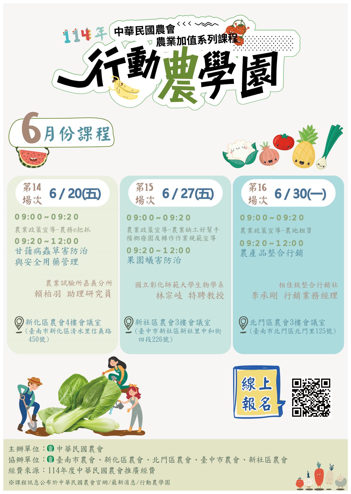 中華民國農會農業加值系列課程《行動農學園》 🌳114年6月份課程開始報名囉!🌳 👨🏫課程目的: 農業知識的傳遞是奠定農業發展的基石,為服務農民及精進農民生產技術及提升產業能力以及配合政府推動農業政策行動策略,本會自105年起開辦「行動農學園」系列課程,開放各農會以在地農民課程需求提案辦理,與在地農會共同協助農民從農工作與時俱進。 👥參加對象: 產銷班班員、農民、青農及農會人員或對從事農業有興趣者。 ⏰課程時間: ◆第十四場次「甘藷病蟲草害防治與安全用藥管理」:6月20日(五) 9:00-12:00,新化區農會4樓會議室。 ◆第十五場次「果園蟻害防治」:6月27日(五) 9:00-12:00,新社區農會3樓會議室。 ◆第十六場次「農產品整合行銷」:6月30日(一) 9:00-12:00,北門區農會3樓會議室。 💻報名方式:採線上報名或報名表傳真報名 04-24854573。 #中華民國農會 #行動農學園 #臺南市農會 #新化區農會 #北門區農會 #臺中市農會 #新社區農會